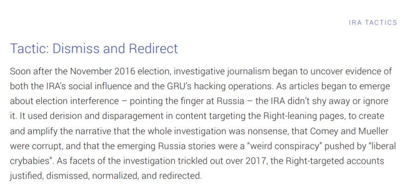 As this conspiracy widens that crack, so too does the deep state conspiracy widen the fissure between Trump supporters and everyone else, including conservatives who don’t adhere to this conspiracy. Worth mentioning again, pushing conspiracies is just one aspect of their tactics. The latest Senate release on Russian Active Measures covers much more. For instance, the impersonating and targeting of African Americans plays a key role in part of their operations. I’d urge anyone who wishes to learn more about the Dark City to read through that report.