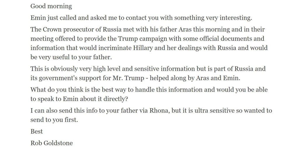 Following the failed messaging attempt via Padadopoulos, May 2016 was busy, in terms of outreach. On May 7, 2016, Konstantin Kilimnik took a 3:00 a.m. train to meet with Paul Manafort alone in New York City. (MR, Vol. I. p. 138) On May 17, 2016, Jared Kushner received an email from a Trump policy aid named Rick Dearborn, wherein Dearborn relayed that an officer of a Russian state-owned bank wanted to meet with a high-level Trump campaign official and that this officer claimed to be carrying an offer from Putin. (MR, Vol. I. Footnote 651) Finally on June 3, 2016, Rob Goldstone reached out to Donald Trump Jr on behalf of Emin and Aras Agalarov, who had asked him to pass along a message from the Crown prosecutor of Russia, per Goldstone.