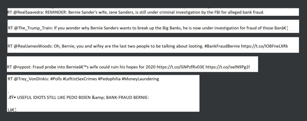 Message Theme: Bernie and his wife committed bank fraud. Also, Biden and Bernie are pedophiles.