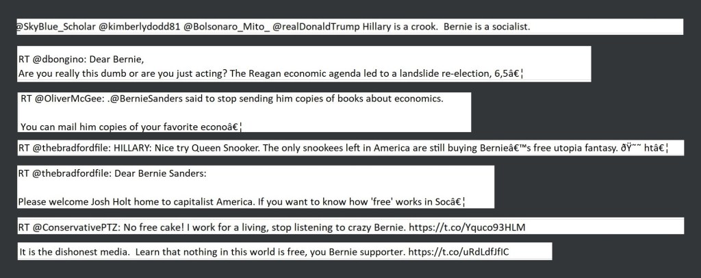 Via cherry-picking and amplifying of derogatory information about Trump’s opponent, while pretending to promote an alternative candidate, they sought to disenfranchise two potential demographics at once, namely black voters and Bernie supporters. For one former follower, none of that was a red flag. It was only the pro-Trump turn which set off alarm bells. Other users may have continued following the account, despite that turn. But even if every single follower decided to unfollow at that point, the messaging which discouraged voting for Trump’s opponent still sunk in. That’s still a ‘win.’ Even if they didn’t achieve a second ‘win’ by converting some of the targeted audience into Trump voters, it was a ‘win’ if any decided not to vote in the general election based on the repetitive derogatory Clinton posts that were amplified on social media.