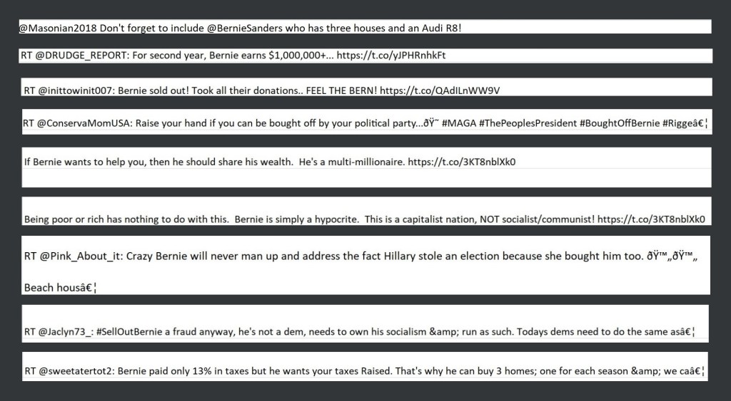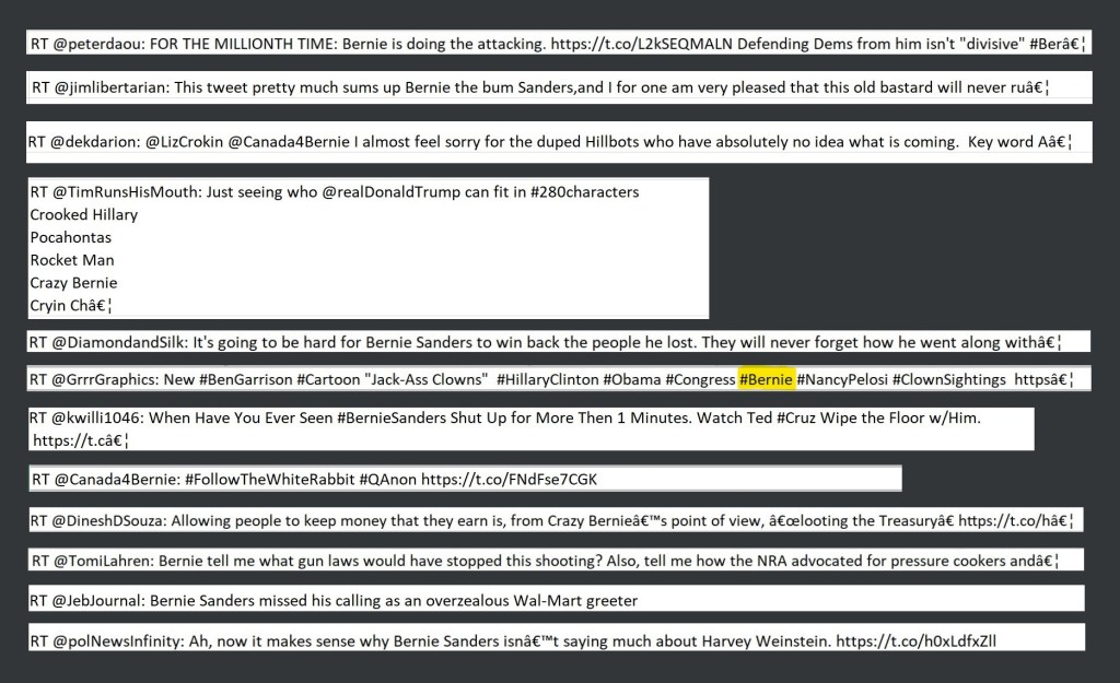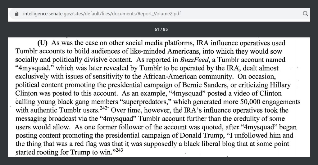 Those seven words are included in that paragraph to illustrate the point made in the introductory sentence of the paragraph. The other 85 pages of the report further contextualize the methods and tactics that were deployed by these accounts. Ostensibly ‘supporting’ Sanders was merely Step 1 of that portion of the influence operation. The goal in 2016 was to harm Trump’s likely opponent (Clinton) to help Trump. Squeezing Trump’s likely opponent from multiple directions was the strategy. As we’re seeing in the run-up to the 2020 elections, it doesn’t particularly matter whom that opponent might be. Clinton is not running and they are still using similar tactics to achieve the same objective.