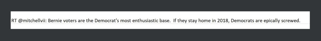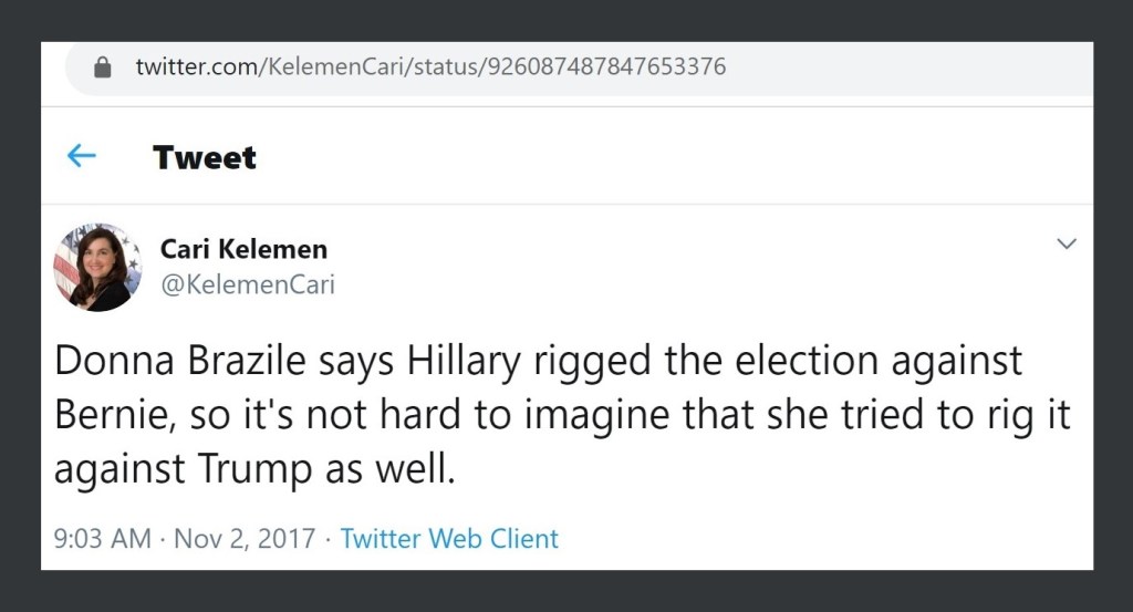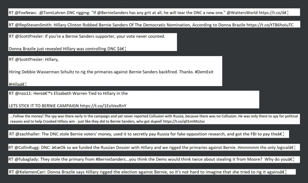 This tweet they promoted reveals one of the purposes of claiming the 2016 primary was rigged against Bernie Sanders. Once this narrative had been established, it was used to suggest that Hillary Clinton may have rigged the 2016 elections against Trump. In the retweet listed just before this one, this general narrative was used to push the idea that the Dems may have rigged it against Roy Moore. It was also used to make allegations about Elizabeth Warren.