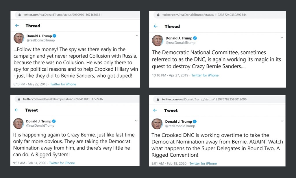 Not only did the Russian-linked accounts boost Trump’s tweets on the 2nd and 3rd of November, but one such account retrieved Trump’s May 18, 2016 tweet about the system being rigged against Bernie and retweeted it on November 3, 2017. Notably, that 2016 Trump tweet was posted two months prior to the dump of the hacked DNC emails. This is a type of narrative that Trump has been pushing for quite some time. As a matter of fact, he pushed it in 2016, 2017, 2018, 2019 and he pushed it just this month.