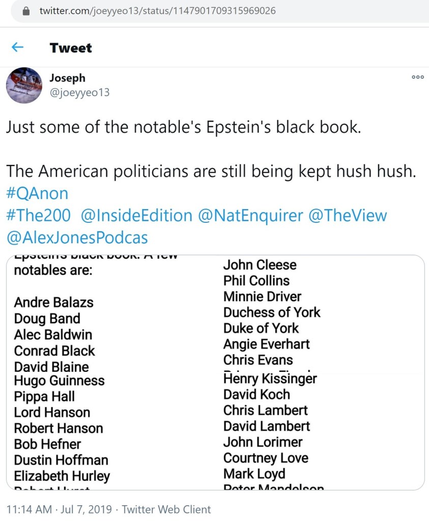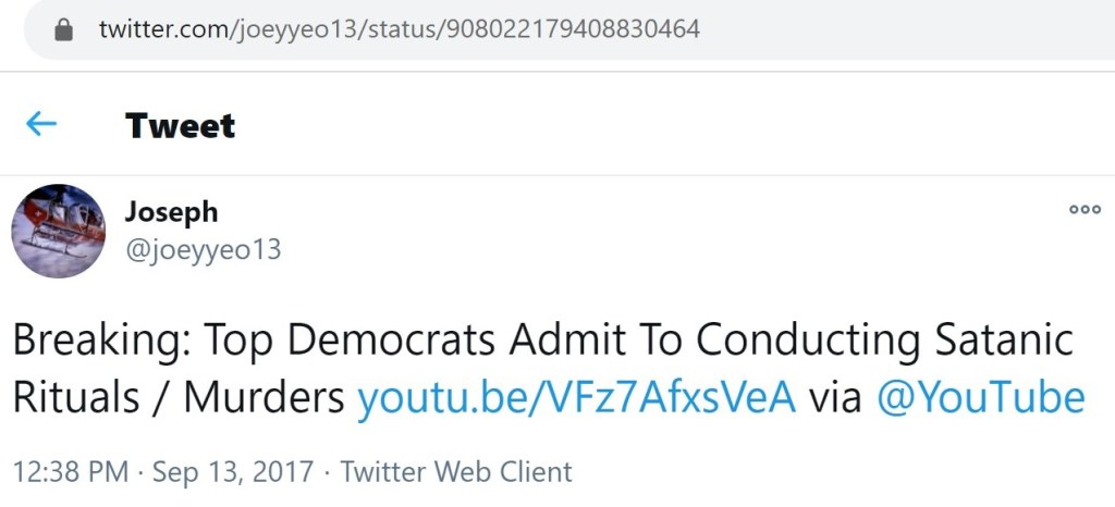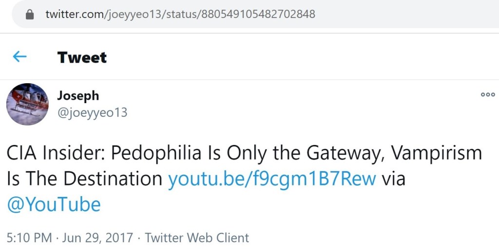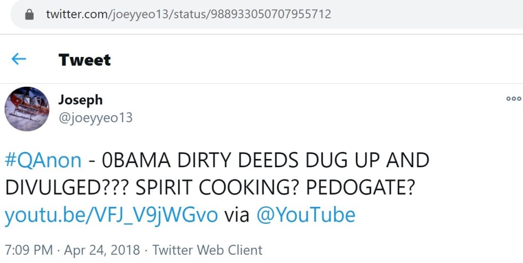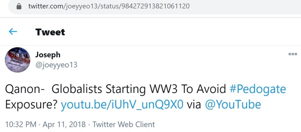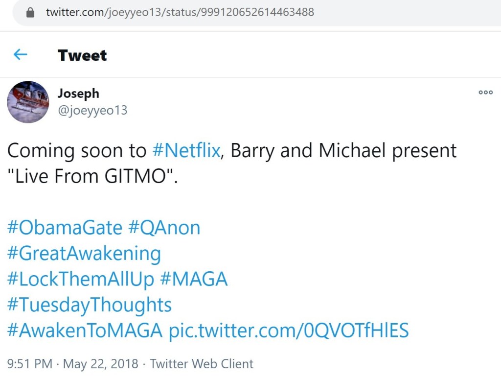 I suppose the best way to wrap this up would be to highlight @joeyyeo13’s seamless migration over to using QAnon hashtags. As seen throughout and as seen below, these smears targeted a multitude of public figures, most of them inside the US. The smears don’t stop there. There is a final point I think is worth emphasizing, even though I know that some folks who do not support Trump may not want to hear this. The proliferation of such accounts online also acts as a smear of Trump supporters who have no interest in Q. By misrepresenting the size of QAnon support online, it misrepresents the views of the average Trump supporter. Such accounts also seek to slowly influence the views of Trump supporters over time. After several years of such messaging, it certainly appears that there has been at least some ‘progress’ made in those endeavors.