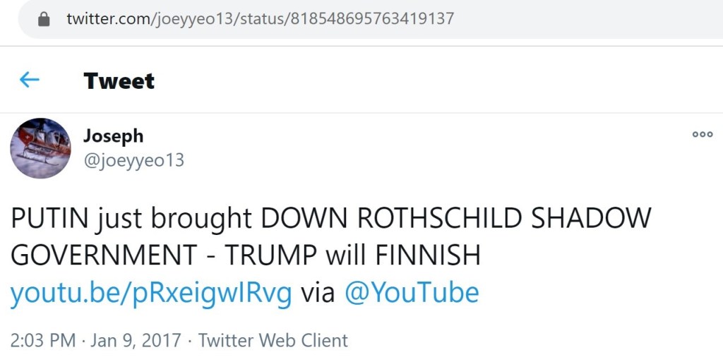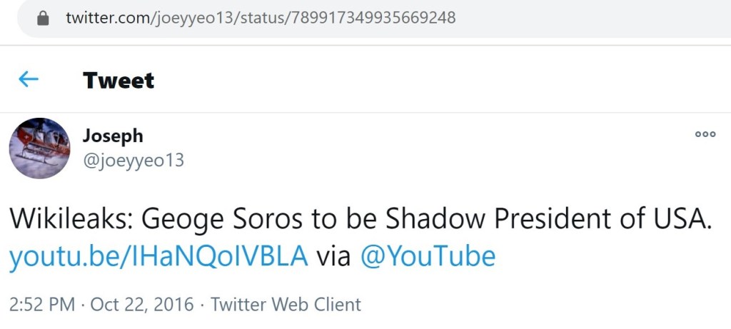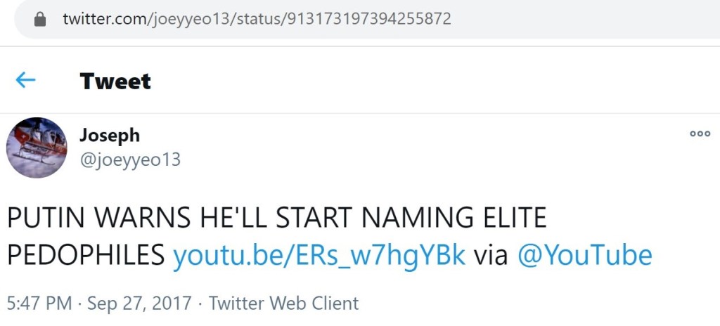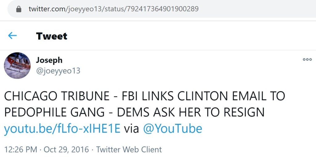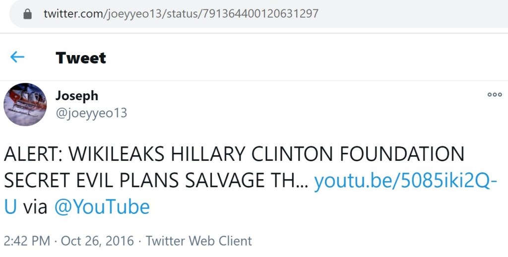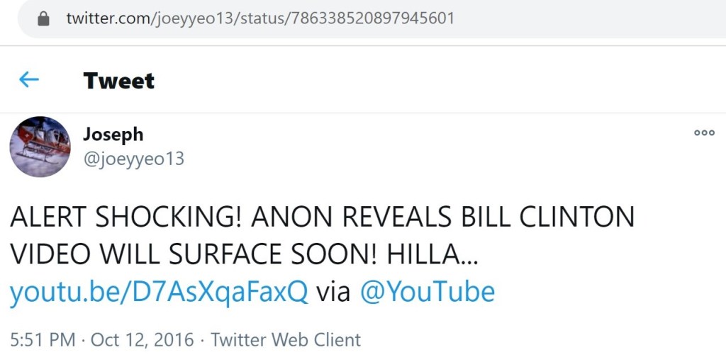 Only two of the linked videos are still available. The link in the October 12, 2016 tweet leads to a mirrored copy of a video which is narrated by a computerized voice and features an animated CGI Guy Fawkes mask. The computerized voice claims without evidence that Bill Clinton sexually molested a child and also managed to implicate Hillary, the Israeli government and others in this smear. This was posted prior to the Pizzagate smear and accumulated over a million views, as indicated in the video title. There is a possibility that such content affected the outcome in 2016. Even if Hillary had won, such smears could slowly undermine the credibility of the White House both inside the US and, more importantly, around the world.