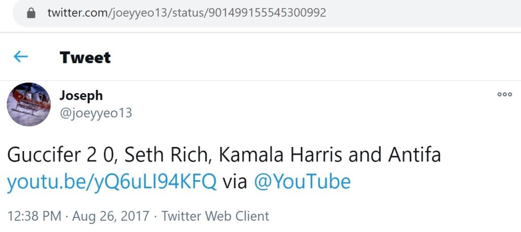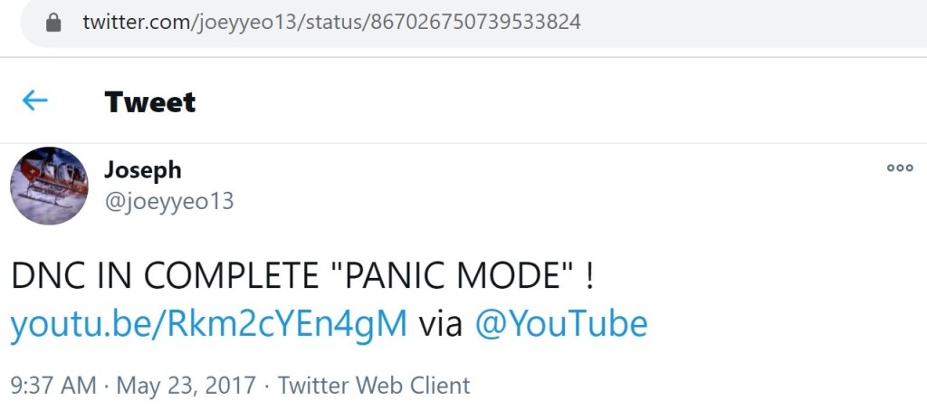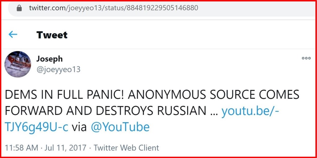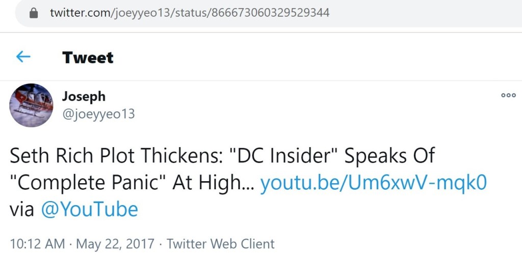 The channel also mixed in various attempts to blame someone besides Russia for the hack of the DNC. It even featured a claim that the DNC files were copied locally, not hacked. @joeyyeo13 posted a tweet with identical wording (minus the “BOMBSHELL”) and a link to a different YouTube video which is no longer available. This may have come from one of the other channels that DFRLab documented. The channel obsessed over Seth Rich and the Awan brothers, all of whom have been used as scapegoats by IRA trolls. The false allegations about Seth Rich were far more definitive, because unlike the Awans he cannot rebut such allegations due to his death.