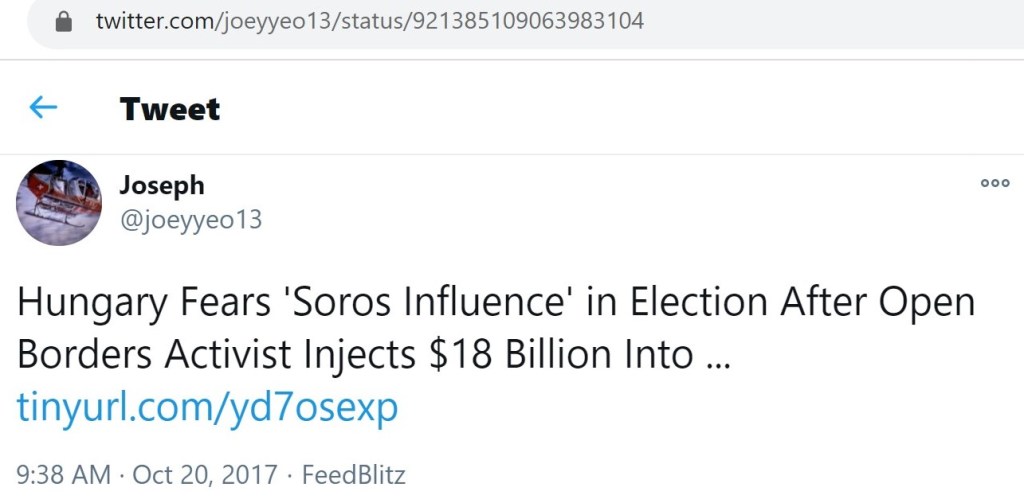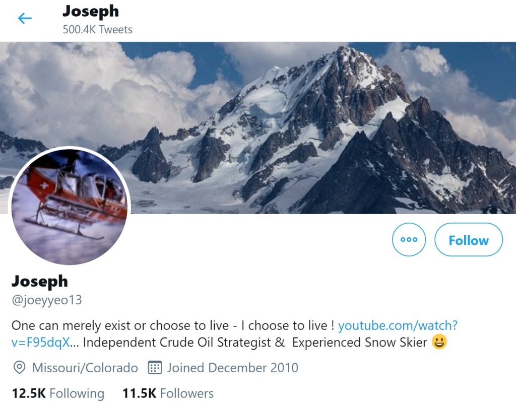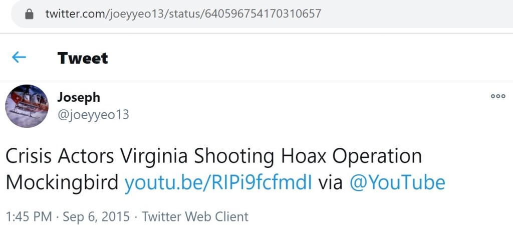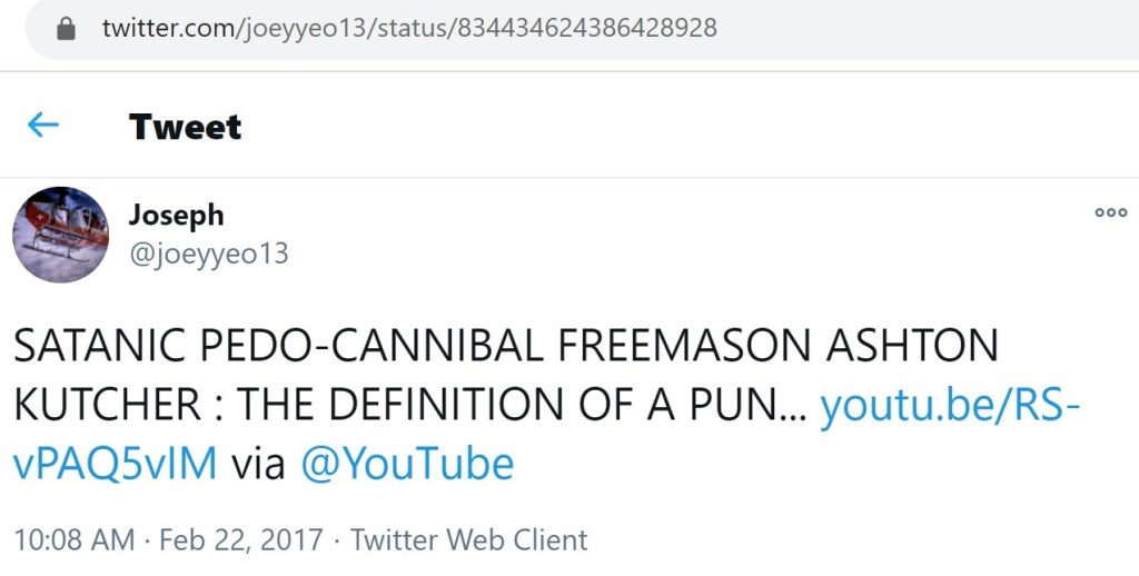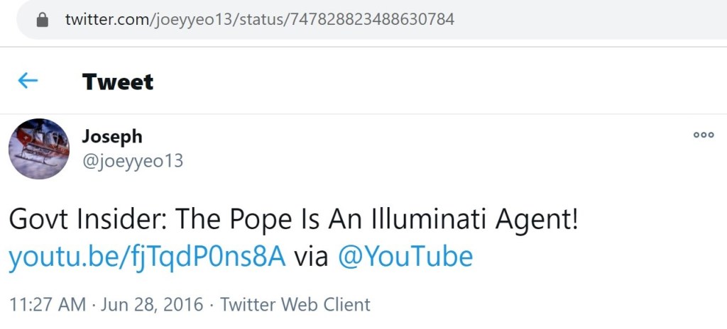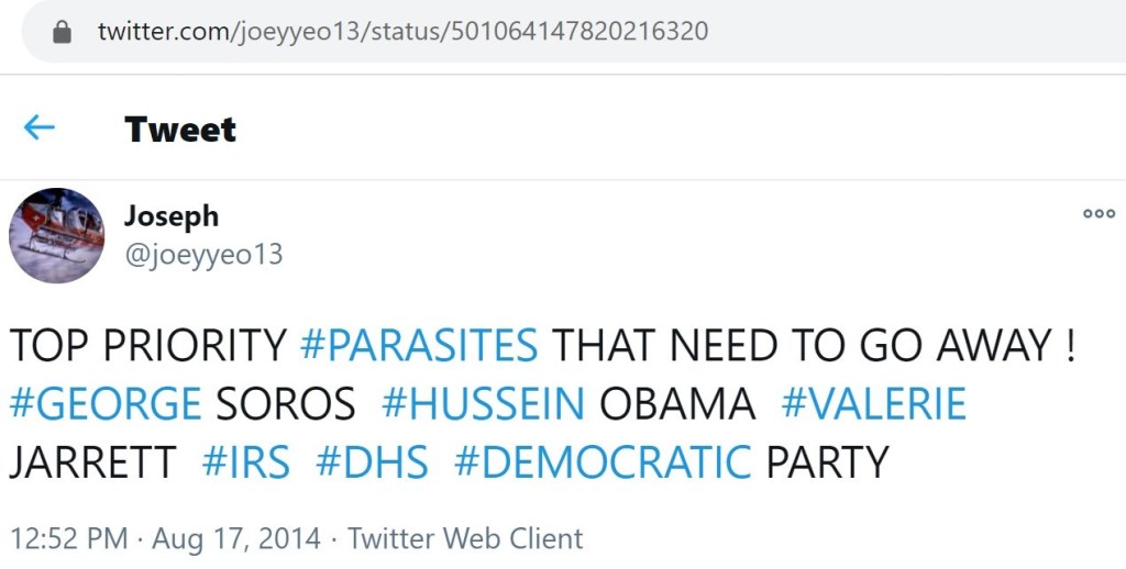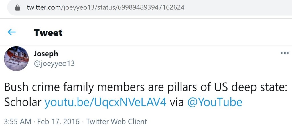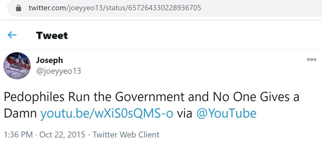 Aside for the very high volume of activity, the YouTube link caught my eye. It leads to an unavailable video, which indicates that the operator hasn’t been paying close attention to this bio. The high follower count is also notable. Pew Research recently released a study of Twitter users and of the top 10% of Republican Twitter users, the median follower count was 354. @joeyyeo13 beat the median figure by 11,166 followers. The higher the follower count, the greater the potential for influence, good or bad.