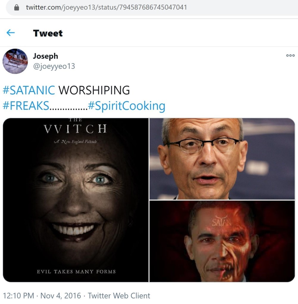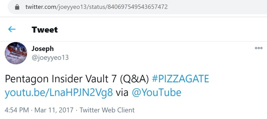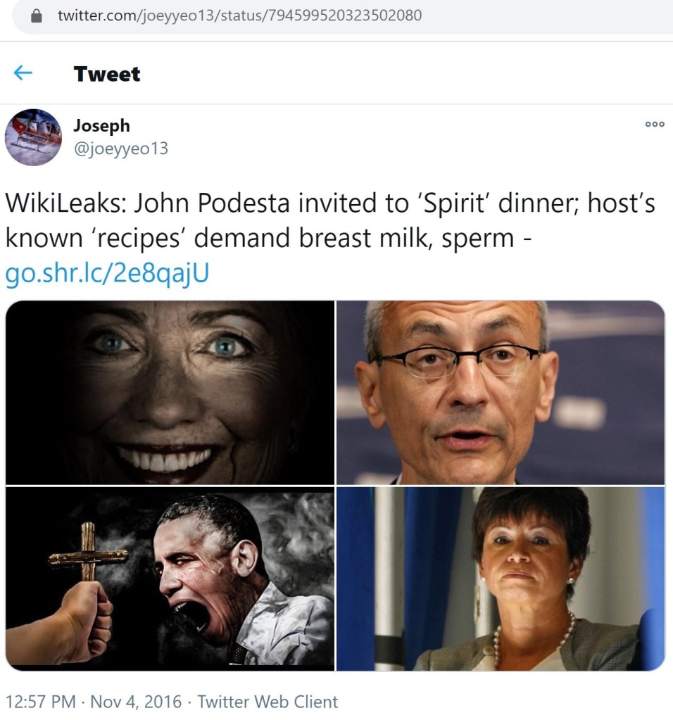 The tweet at 1:07 AM CST preceded Wikileaks’ tweet by nearly 2 hours. The tweet on October 29, 2016 preceded Wikileaks tweet and may have even preceded #Pizzagate. #Pizzagate, as I’m sure readers are aware, is a baseless smear that emerged just before the 2016 election. It alleged that members of the Clinton campaign and others were part of a pedo ring. It alleged that references to one of America’s favorite foods, namely pizza, were instead code used by child predators. In the months and years after the Pizzagate smear began, various American celebrities and public figures have been subjected to smears based upon references to pizza.