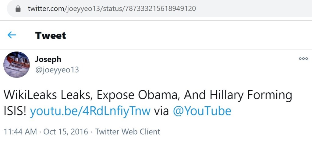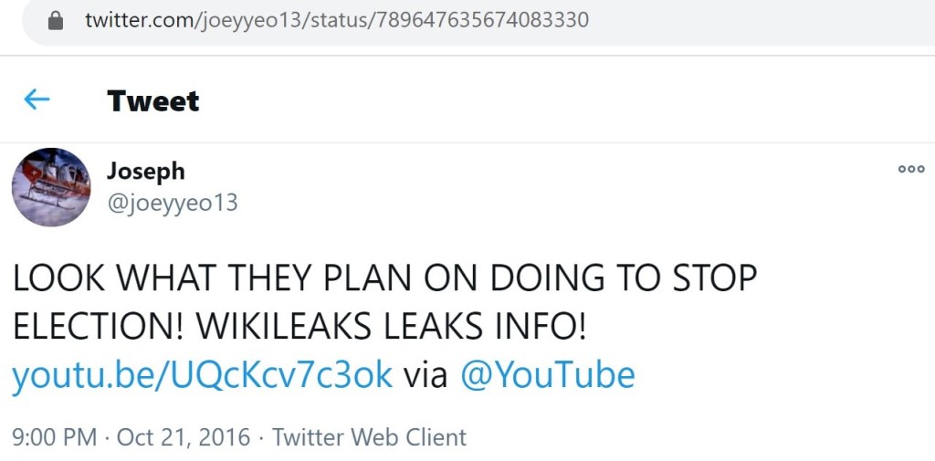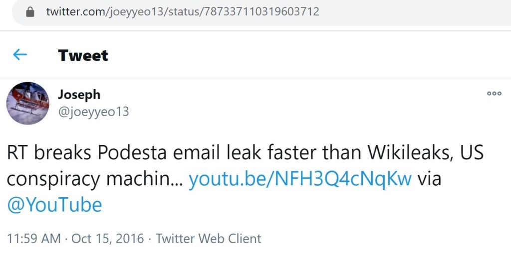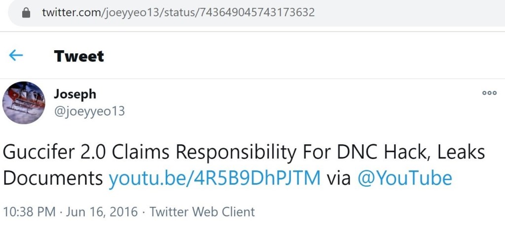 Starting in mid-2016, this acct began posting content regarding Guccifer 2.0, DC Leaks, and Wikileaks. The Guccifer 2.0 persona began dumping material on June 15, 2016 and sought to misdirect attribution from Russian operatives to a fictitious Romanian hacker. @joeyyeo13’s post came the next day.