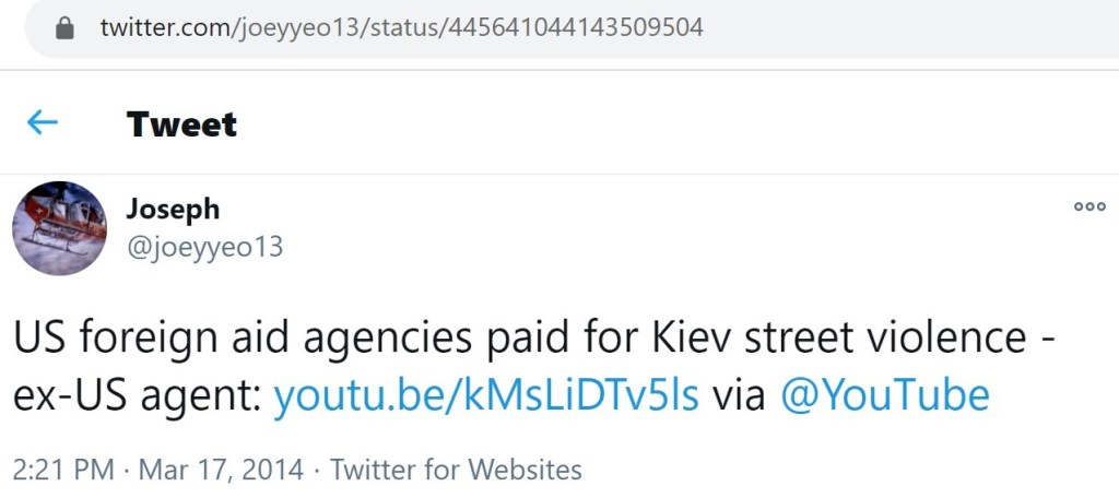 In the March 2014 tweet, the YouTube link leads to a video from RT (Russia Today). Three of these four tweets attempt to project the blame from Russia onto the US. Such messaging serves as both a smear of the US and as a shield for the Russian government’s ongoing imperialist aims in Ukraine and elsewhere.