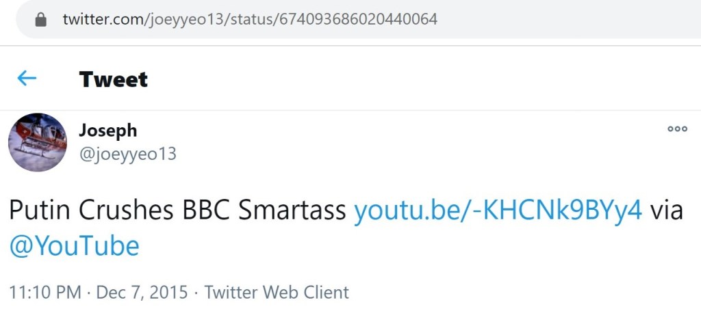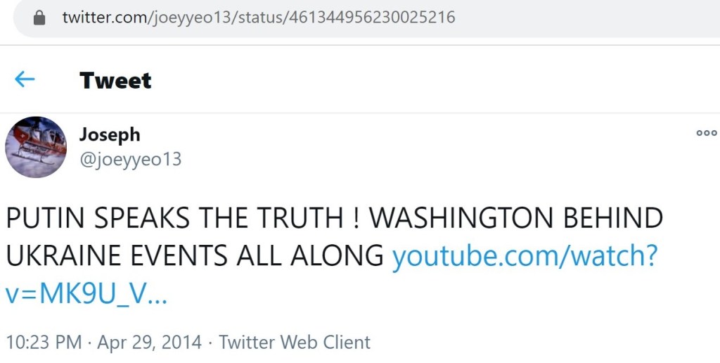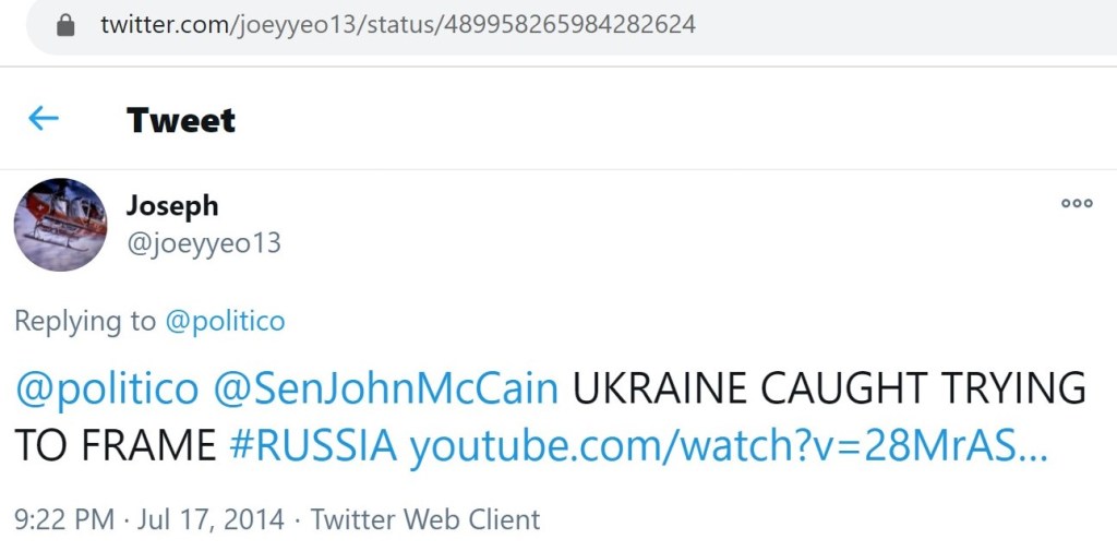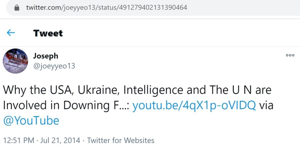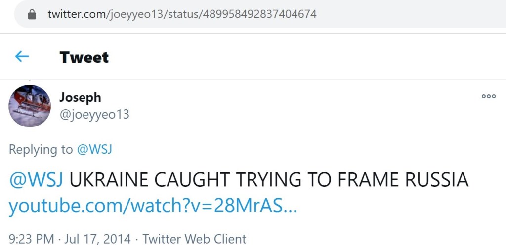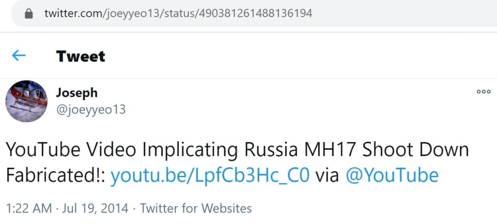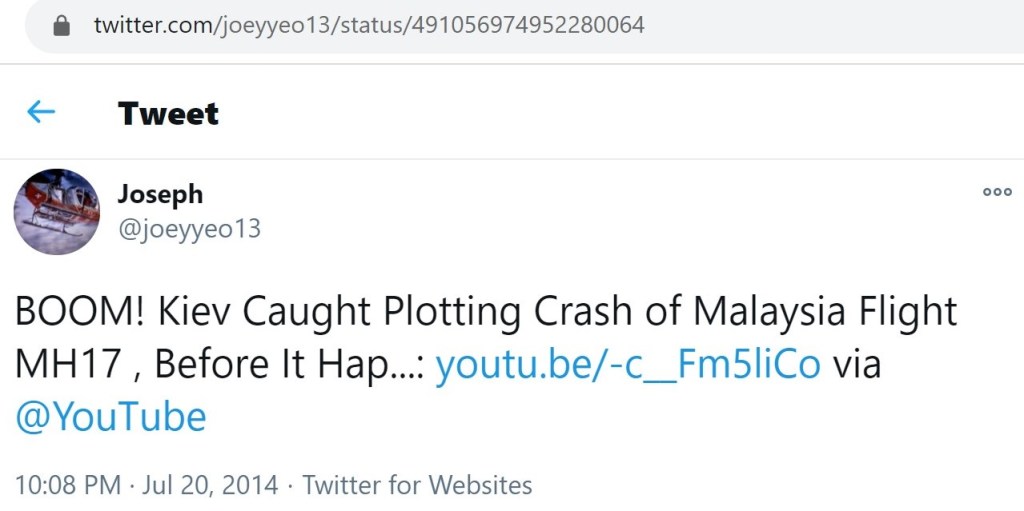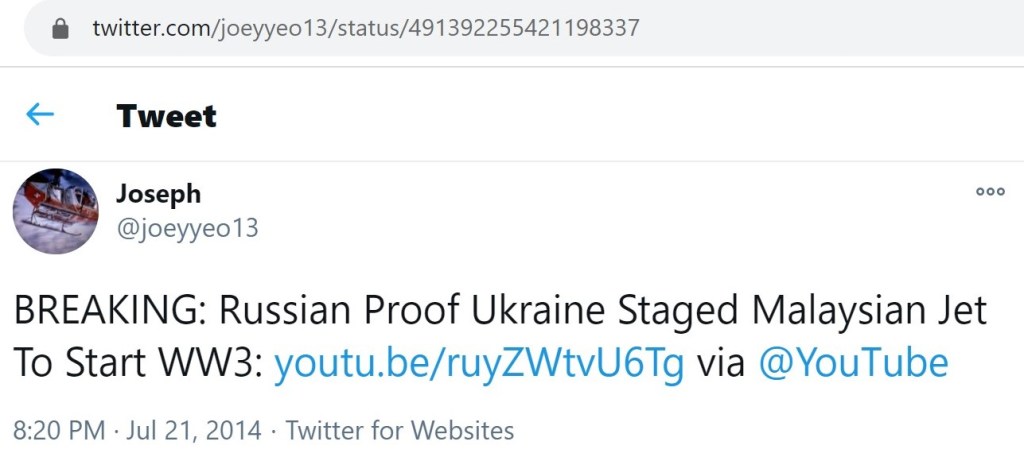 On July 17, 2014, Flight MH17 was shot down by a Russian Buk missile from territory held by pro-Russian forces in Ukraine, according to the Joint Investigative Team (JIT). In the immediate aftermath of this disaster, Russian trolls began an extensive online campaign to redirect the blame to Ukraine and elsewhere. They also sought to undermine the MH17 investigation. @joeyyeo13 was involved in spreading such messaging.