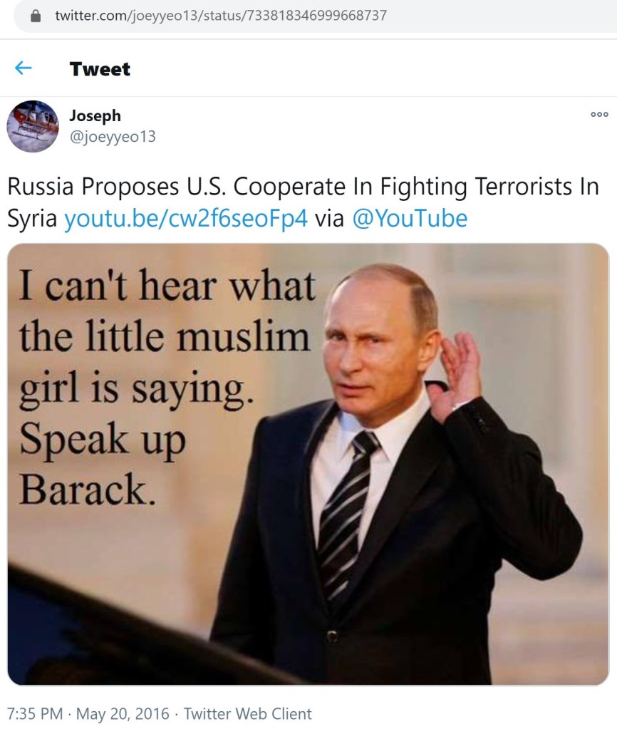 Beyond the fact that 84 different Russian trolls promoted this account, the primary reason I have a high degree of confidence that @joeyyeo13 is operating on behalf of the IRA is the type of content this account produced. I must note that thick partisan blinders are the primary potential obstacle which might prevent readers from seeing this content for what it is. Partisanship is precisely what such operations seek to exacerbate and then exploit.