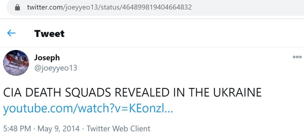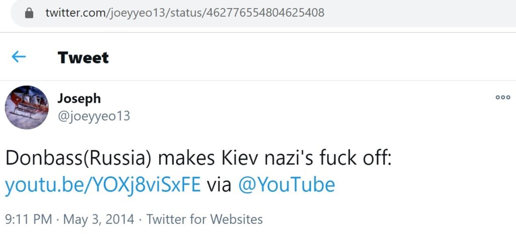The first video has since been made private. The linked video in the May 9, 2014 tweet is from an account that has since been terminated. A significant number of the linked videos throughout this analysis have since been made private, are unavailable, or are from terminated accounts. The usage of “the Ukraine” in the May 9th tweet is typical of Russian propaganda (and of Westerners who don’t know better). This messaging seeks to undermine the reality that Ukraine is an independent nation, by referring to Ukraine as though it is just a region.