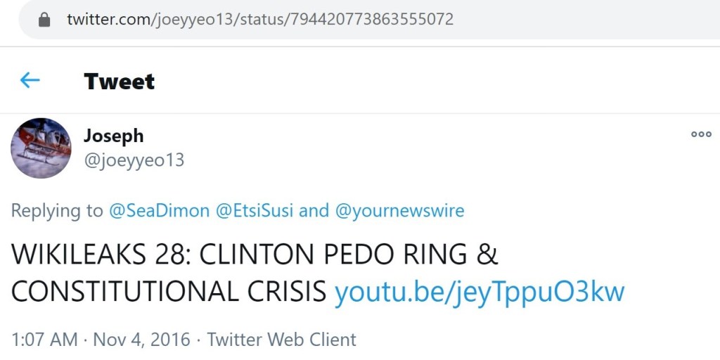 Evidence and indications of advance knowledge about upcoming Wikileaks publications was a trend in 2016. Another example occurred on November 4, 2016 in advance of Wikileaks tweet about ‘Spirit Cooking.’ That tweet was published at 3:06 AM CST and many Americans would wake up later on the 4th to find #SpiritCooking trending. @joeyyeo13 would contribute to that topic and also propagated accusations about pedo rings.