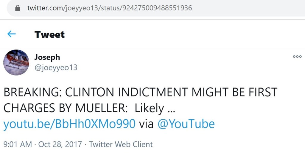 Q amplified a 4chan post from a separate user ID which stated that it would be Hillary Clinton (rather than Manafort) and added, “HRC extradition already in motion effective yesterday with several countries in case of cross border run. Passport approved to be flagged effective 10/30 @ 12:01am. Expect massive riots organized in defiance and others fleeing the US to occur. US M’s will conduct the operation while NG activated.” As captured below, this wasn’t the first instance where false allegations of indictments had been propagated.