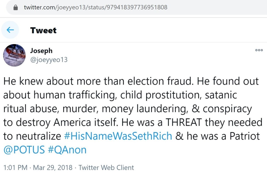 Claims about Seth Rich and the Awans would continue to be perpetuated by Q. Other smears that were produced by Gotcha News Network and propagated by @joeyyeo13 would later appear in Q’s posts. Some examples include: