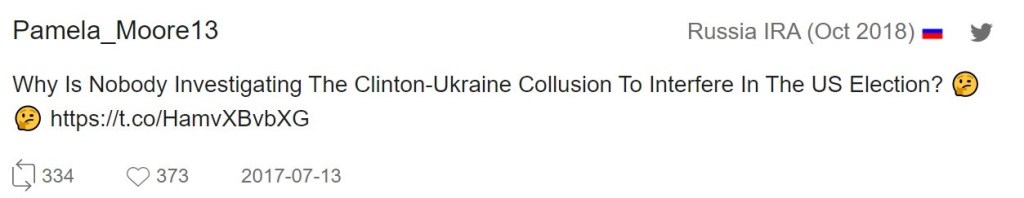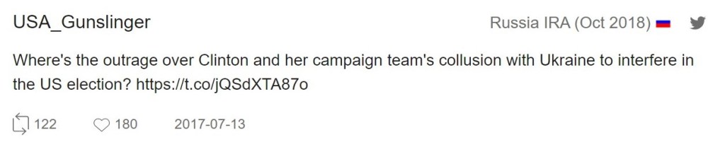 The other red herring is the false attribution of this publication to “The Hillary Clinton Fan Club.” There’s an obvious purpose behind such attributions, especially considering the Ukrainian tie-in via the New York Group Publishing reference. The Internet Research Agency and Russia’s media outlets were quite keen on falsely asserting that there had been collusion between Ukraine and the Clinton campaign. As the investigation into Russian interference heated up in 2017, the trolls pushed these claims in response.
