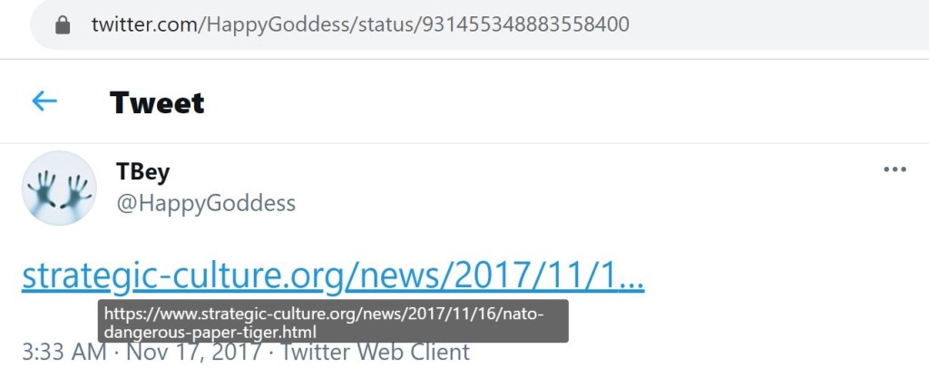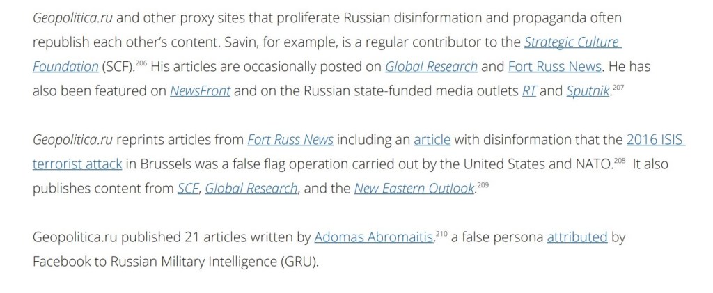 This account also spread content from Fort Russ News, Russia Today (RT), Sputnik News, and the Strategic Culture Foundation, among other sites. These sites are part of Russia’s disinformation and propaganda ecosystem, which includes the site we covered earlier, New Eastern Outlook.