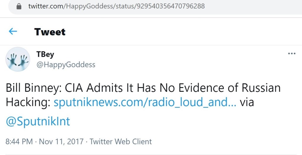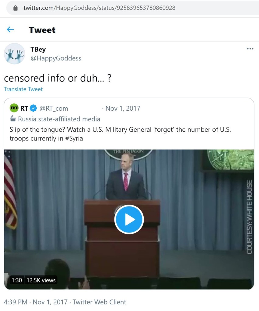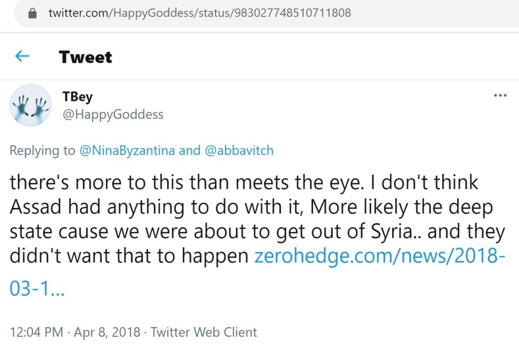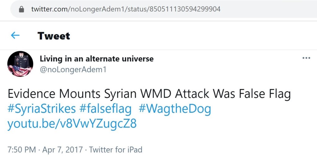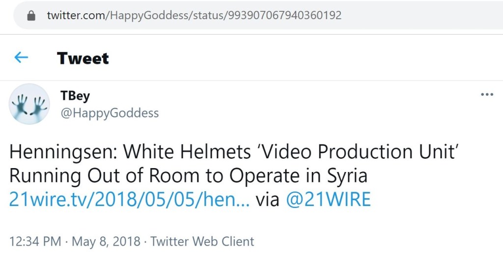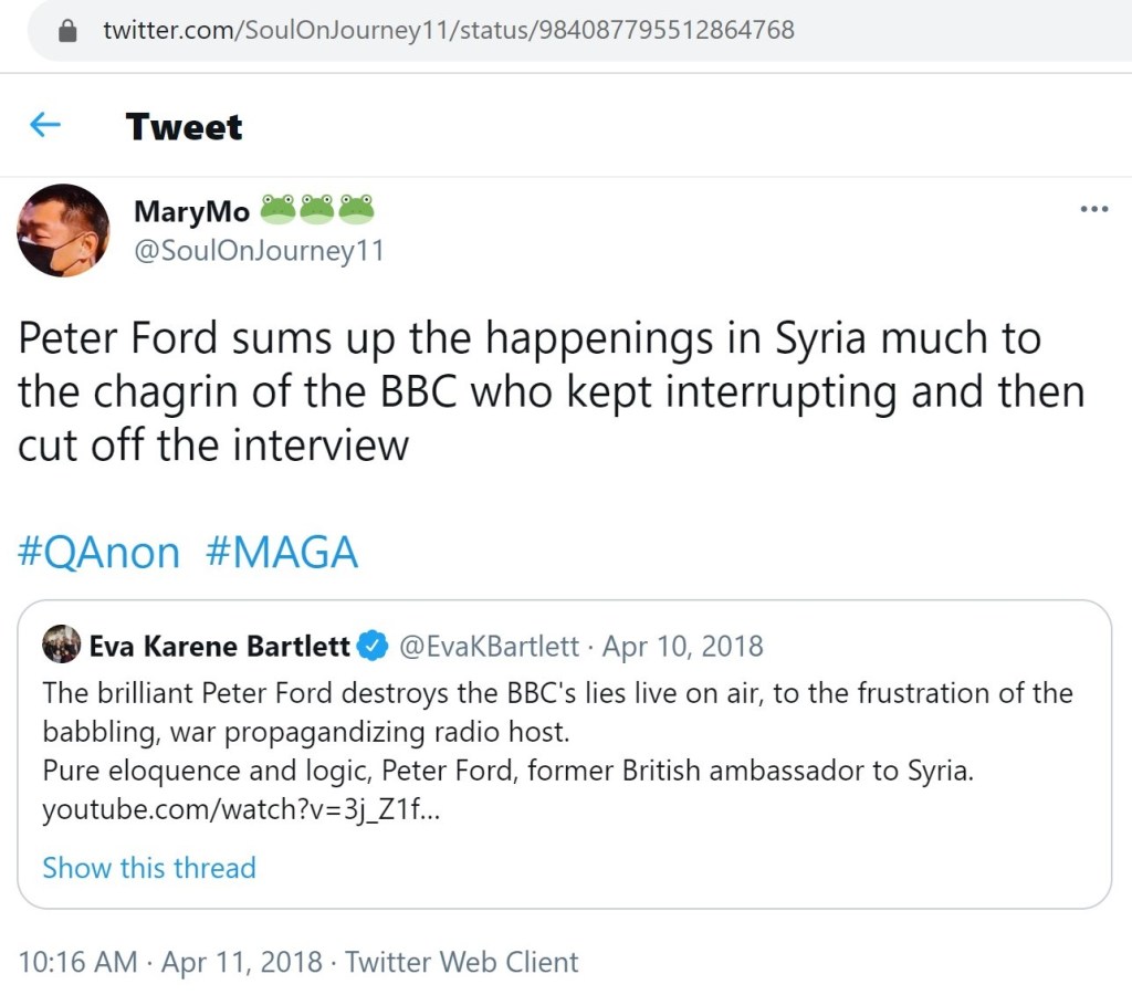 The first tweet from December 2018 links to a Russia Today video on YouTube. I highly doubt I need to go into detail about the April 2018 quote tweet. Most readers surely know who Eva Bartlett is. For those who don’t, a brief search online should give you a decent overview, if you opt to do so.