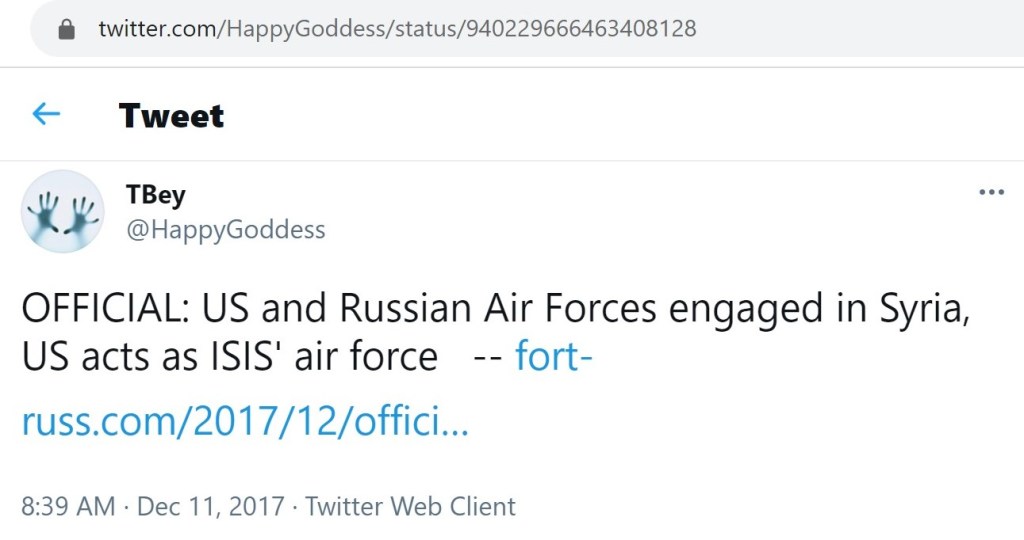 @HappyGoddess didn’t solely tweet links to QAnon posts and content. As seen below, this operator also linked to the Duginist outlet geopolitica.ru. The idea being propagated within that article title has been echoed by Q, albeit not quite so overtly.