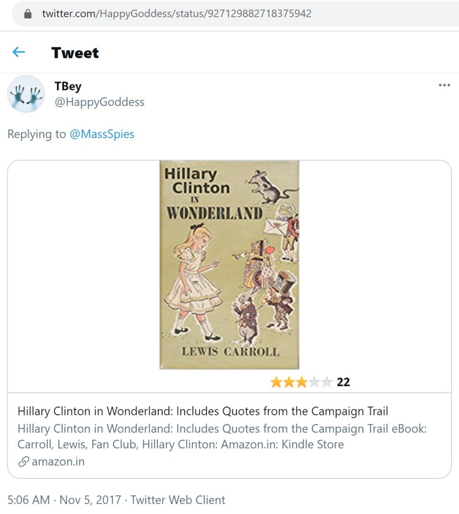 Returning to Q post #86, 4chan users received a direct confirmation that the linked eBook was a “correct reference.” As Q specified in the posts which preceded the first direct link to this eBook, the cover was indeed titled “Hillary Clinton in Wonderland” and the listed author is “Lewis Carroll.” On Amazon, visitors will find the following: