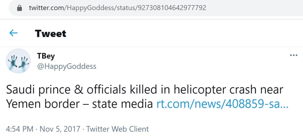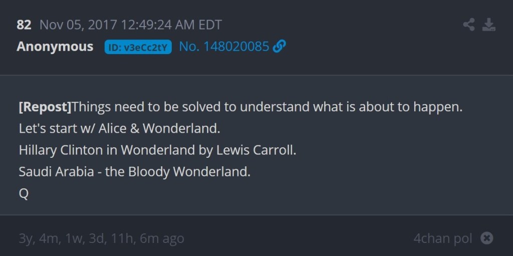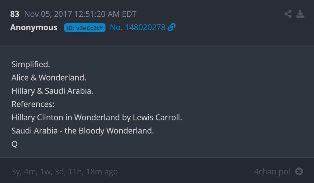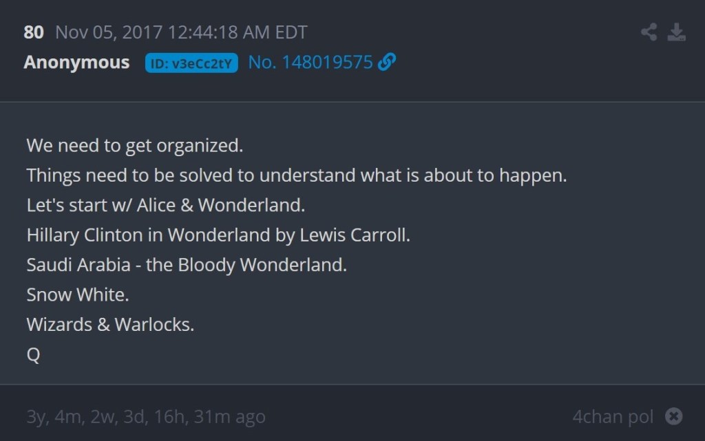 All of that would change on November 4, 2017. On that day, news broke about high profile arrests of a “number of Saudi princes and former ministers.” Q noticed this news and a few hours later, Q referred to that development in a post that included the phrase “Alice & Wonderland.” This was Q’s first post on the 4th of November. A little over an hour later, Q posted the following: