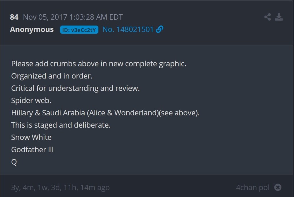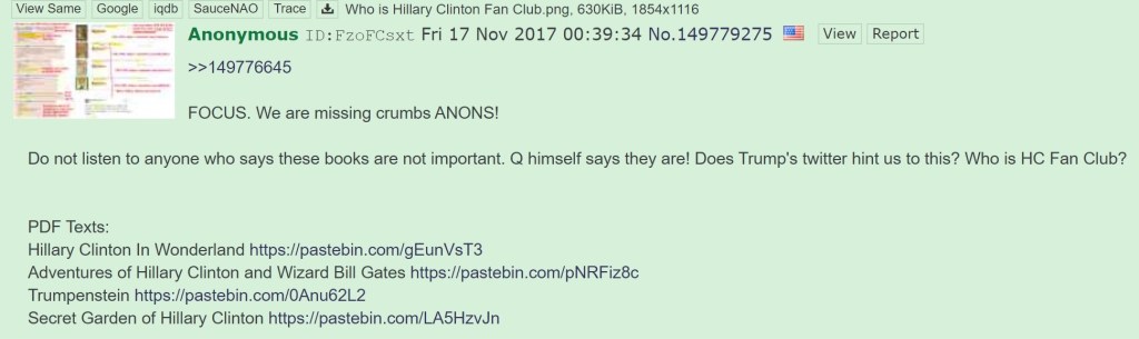 In context, first the news broke about the arrests in Saudi Arabia. Then Q stated that 4chan users would soon find out the meaning of “Alice & Wonderland.” Finally, Q got very specific in order to ‘solve’ that “Alice & Wonderland” reference. 4chan users didn’t solve anything here. Q gave out the ‘answer.’ Up until November 4, 2017, Q had arguably remained vague enough that there could have been a variety of answers. Once the arrests in Saudi Arabia happened, Q decided what “Alice & Wonderland” meant and then told 4chan users the answer. Q even wrote, “This is staged and deliberate.” This was Q, crafting a ‘QProof’ in response to current events and then spoon-feeding that ‘QProof’ to the audience. When an anonymous 4chan user (who could be anyone, including Q) posted a link to the eBook that Q had specifically mentioned, Q responded, “Finally. Correct reference.”