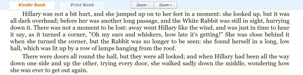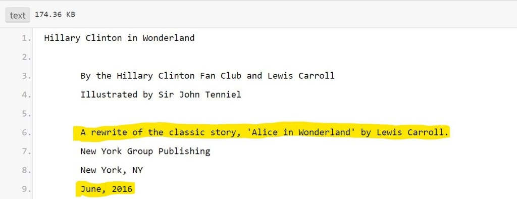 This eBook has a ‘Look Inside’ option on Amazon. Upon clicking through, readers find that this is not what one might consider to be a substantive book. Rather, wherever ‘Alice’ had previously appeared in the original, ‘Hillary’ had been swapped in.