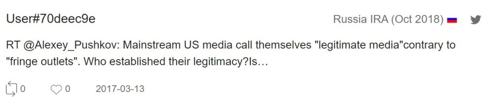 The Internet Research Agency trolls in Saint Petersburg and similar operations mean something slightly different when they refer to the ‘mainstream media.’ Although typically (but not always) left unsaid, what they mean is ‘Western mainstream media’ and ‘mainstream US media.’