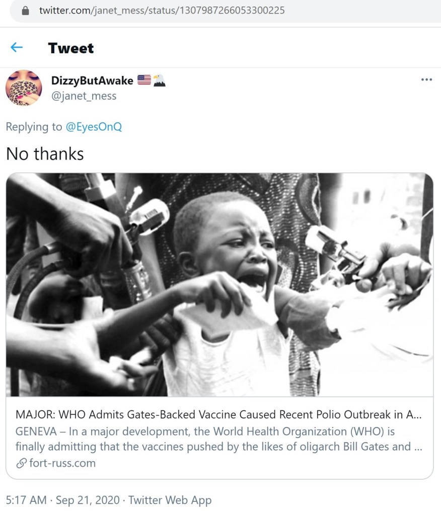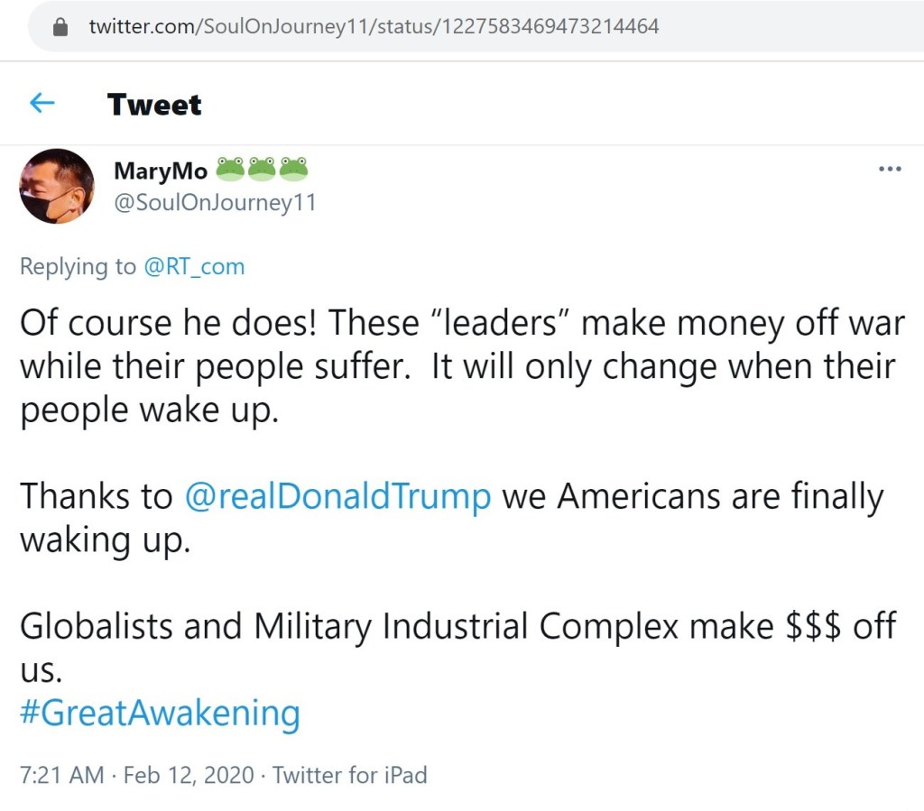 With each of these accounts and with Q, we find that not only do they seek to undermine the ‘MSM,’ but they also uncritically promote content from Russia Today and similar sites.