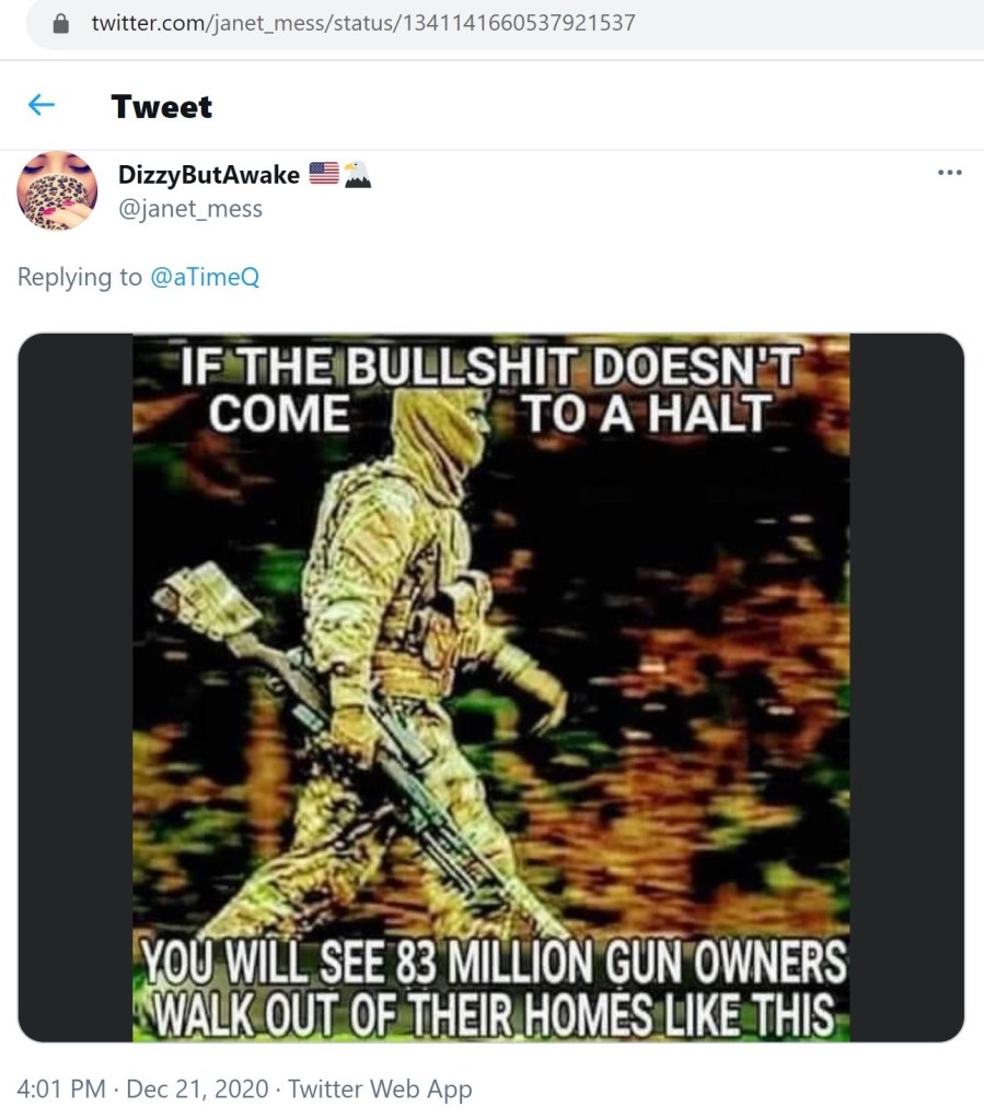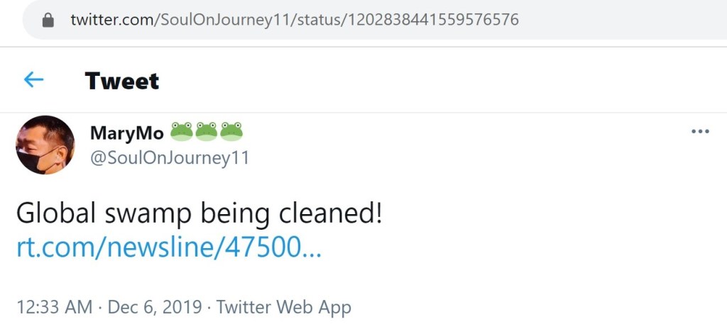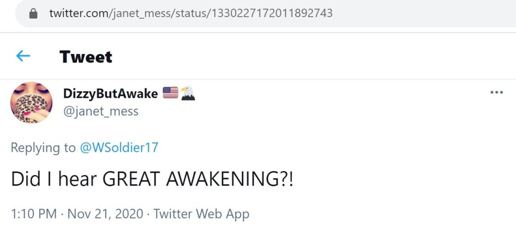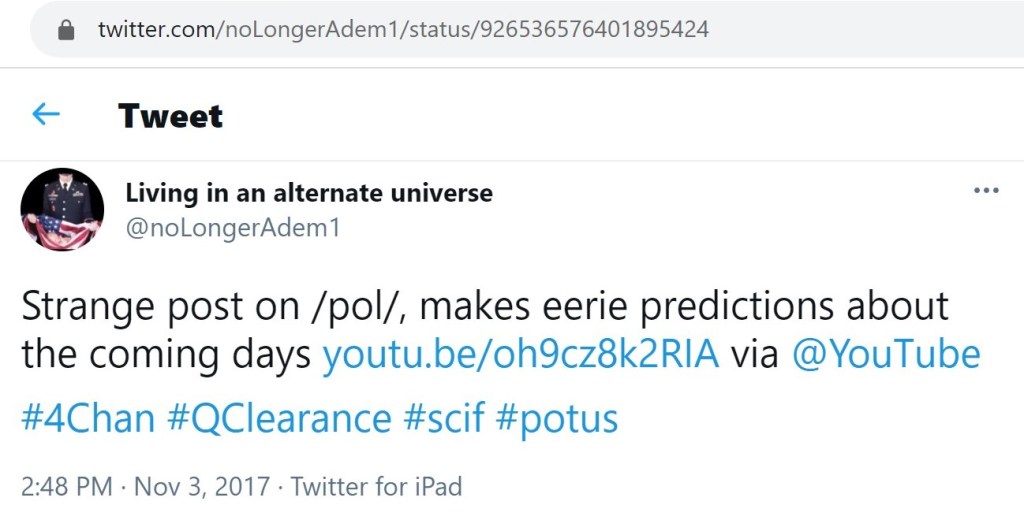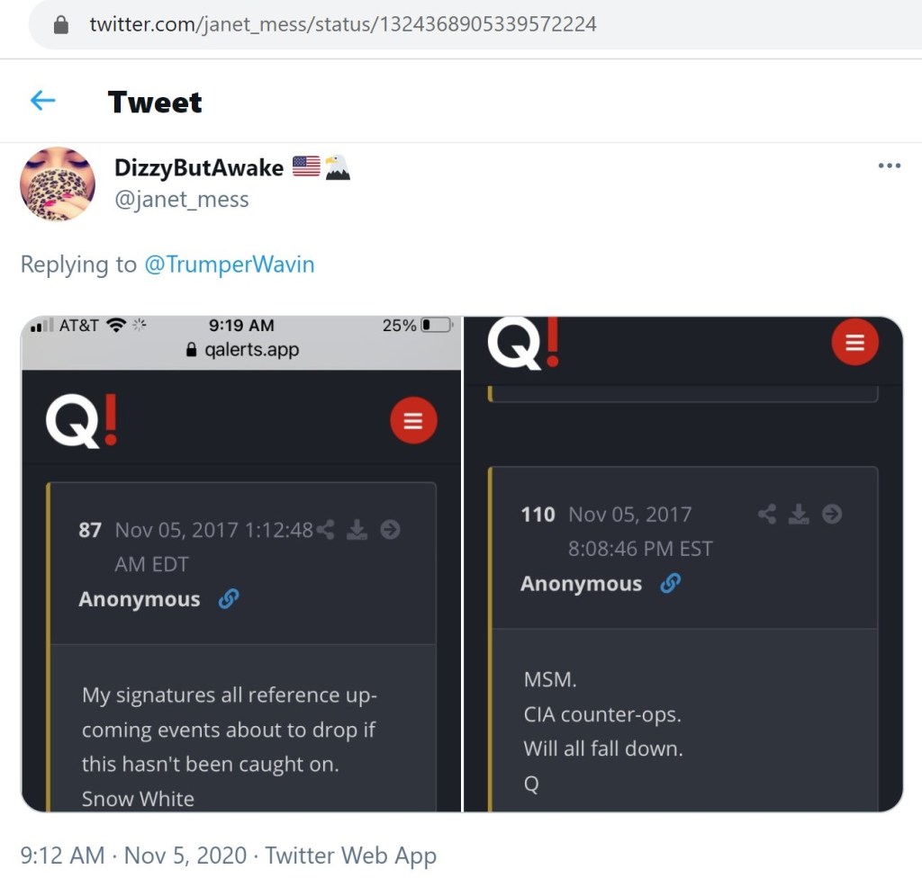 Of the three examples below illustrating this account’s promotion of Q, the tweet dated November 5, 2020 is the most informative. The included screenshot of Q post #110 speaks to a couple of Q’s motives.