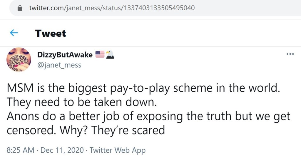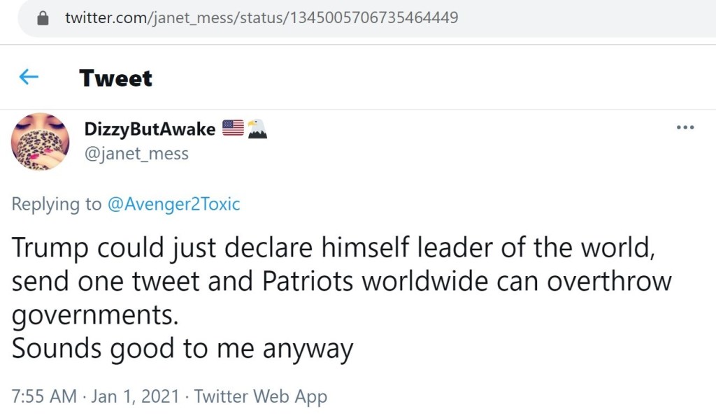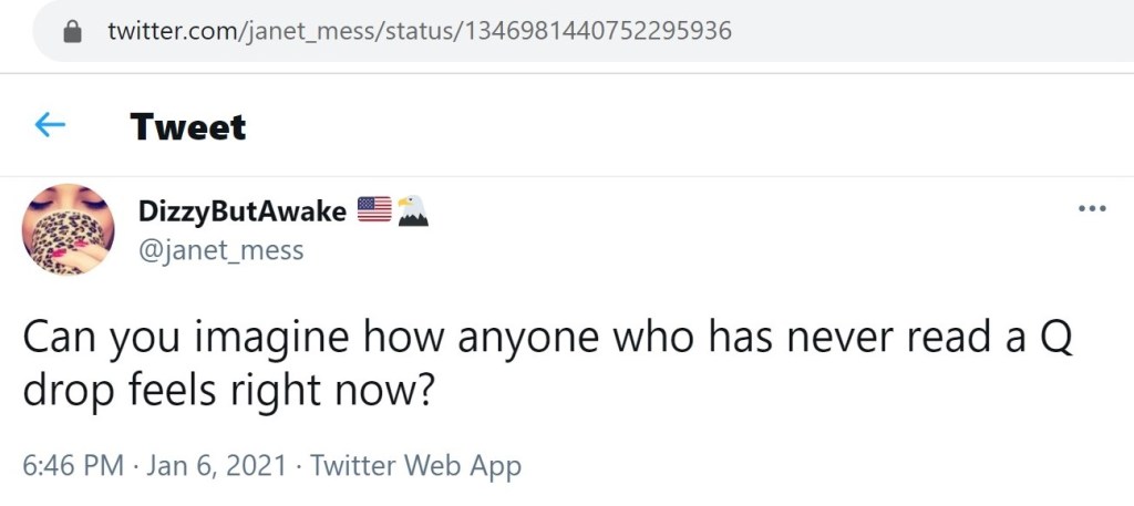 Recently, disinformation researchers have encountered the proliferation of a disingenuous narrative that insists there is no QAnon, only Q and the anons. @HappyGoddess pushed that narrative in February 2021.