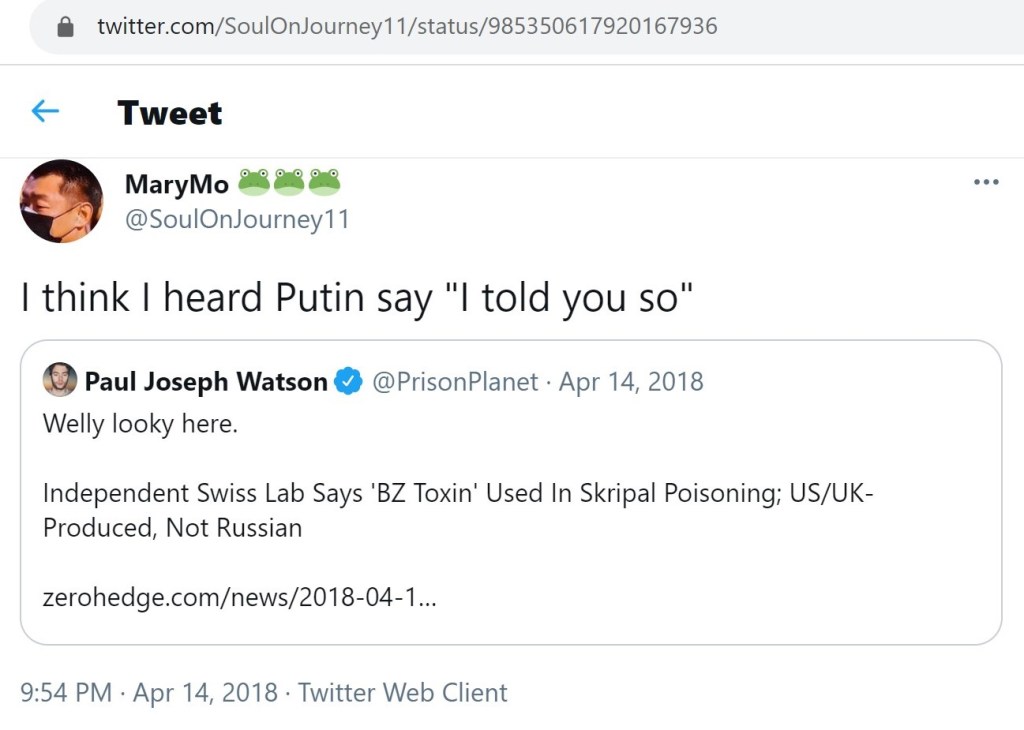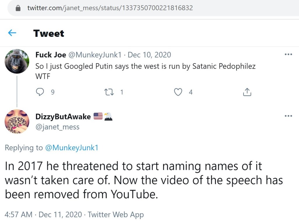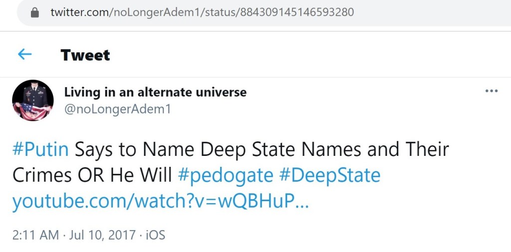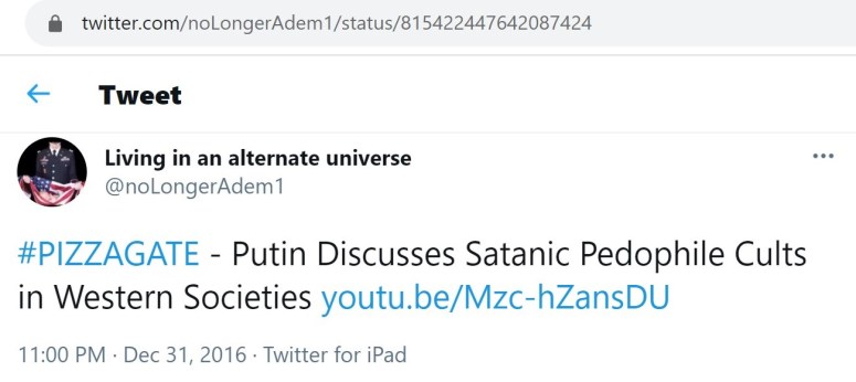 Notably, the aforementioned arrest warrant fact-check traced some of this claim back to the Kremlin-proxy site Veterans Today. As I recently covered on Twitter, Q cited a Veterans Today headline verbatim. It read, “Vladimir Putin: The New World Order Worships Satan.” Unsurprisingly, Putin didn’t actually say that phrase.