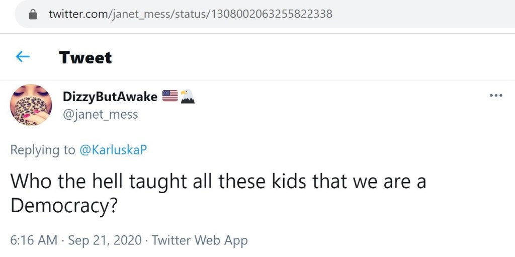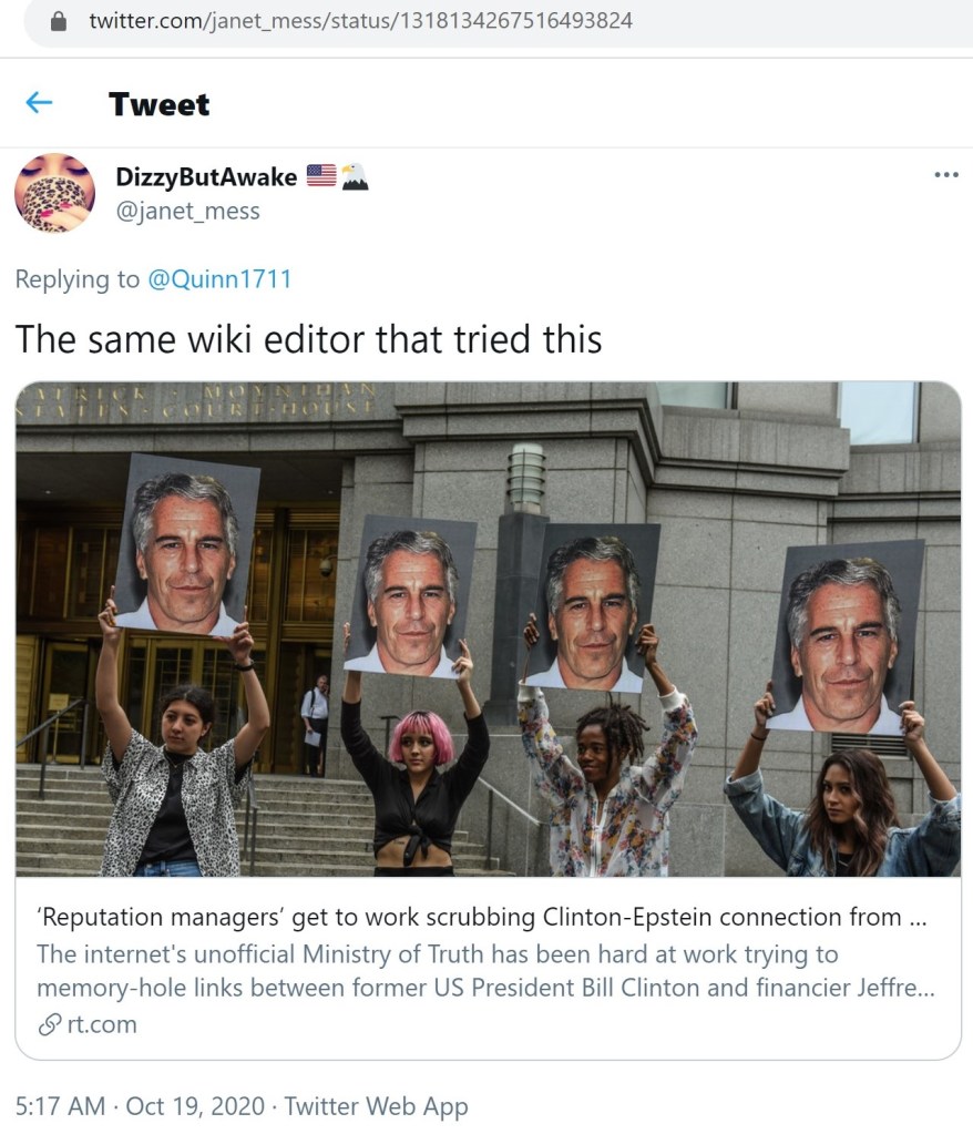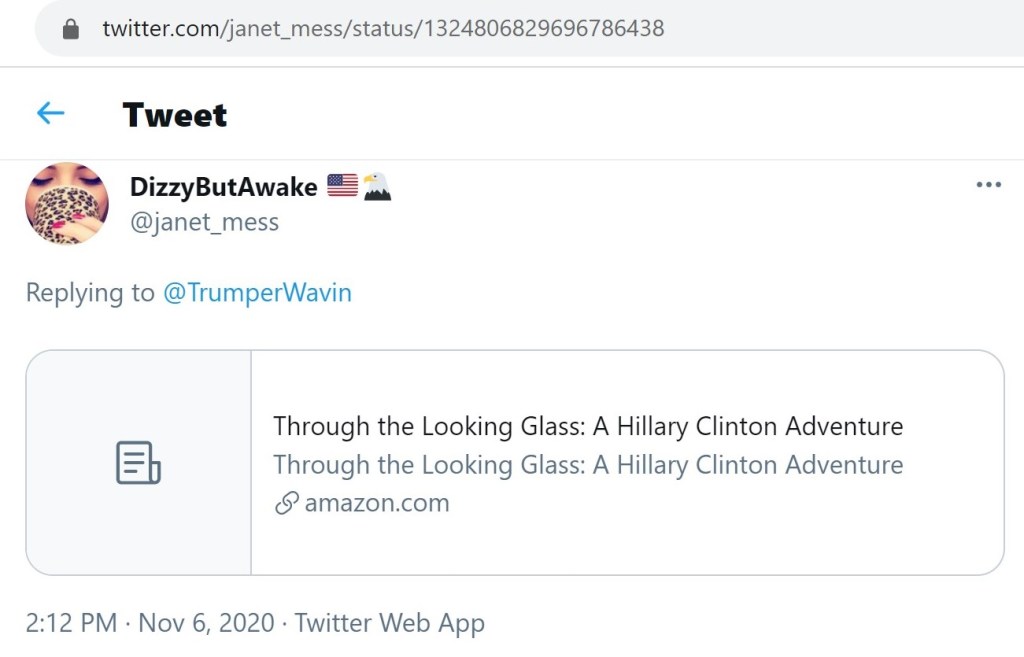 The above tweet was sent a few hours after Q referenced that eBook on November 5, 2017. The Twitter user was a QAnon promoter, as were the others which will follow. Up until mid-August 2020, this user had QAnon hashtags in their Twitter bio, according to archives. All four accounts we’ll be covering here had QAnon messaging and/or imagery within their profiles. Three of the four have removed that messaging and/or imagery, in keeping with Q’s posts which recommended that users drop direct references to Q and QAnon to circumvent Twitter’s moderation of QAnon.