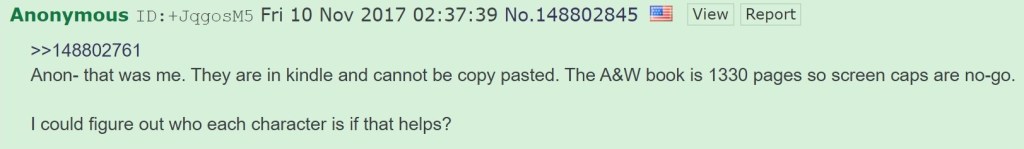As we covered earlier, an anon posted links to all four Pastebin addresses on the 17th of November. Those posts were the first time that the Pastebin for the Secret Garden of Hillary Clinton was linked on 4chan. Due to word usage and other indicators, we can surmise that this is the same anon we’ve been discussing. These posts stated that “We’re/We are missing crumbs” and emphasized the importance of these eBooks. The included screenshots were again identical to each other in the two posts on the 17th of November. Both were also the first to link to the respective Pastebin addresses. Furthermore, in both instances, the user replied to sequential CBTS (Calm Before The Storm) threads on 4chan. On the 10th of November, the user replied to CBTS thread #196 and #197. On the 17th of November, the user replied to CBTS thread #389 and #390.