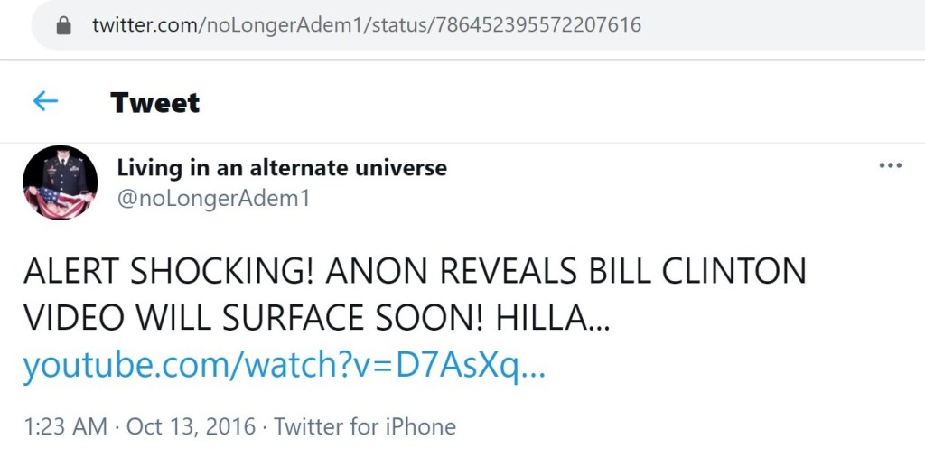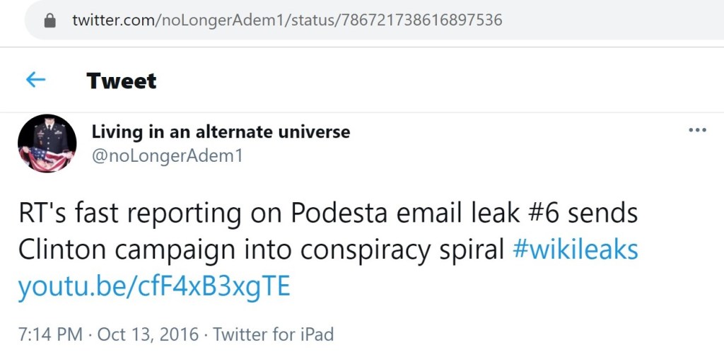 I covered the latter @joeyyeo13 tweet in more detail in that earlier case study. To summarize, when US media outlets noticed that Russia Today published a new Podesta leak before Wikileaks announced it, both Wikileaks and Russia Today offered a very dubious explanation. What I learned from @noLongerAdem1’s tweet is that RT published more than one video attempting to explain it away. @joeyyeo13 linked to one, while @noLongerAdem1 linked to the other.