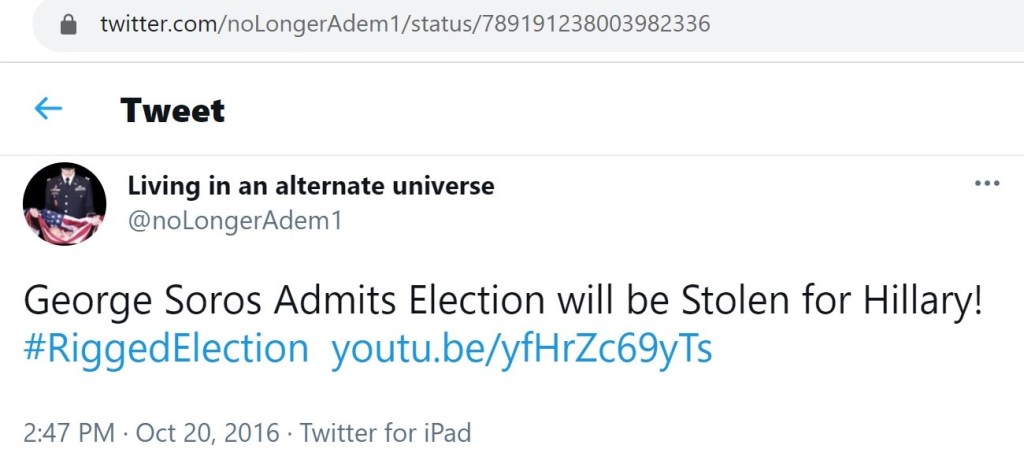 This account also pushed a familiar narrative about Soros and/or the Clintons rigging the 2016 election. Similar narratives would reemerge online in 2020. This may seem as though this is about Hillary and Soros. That is certainly how it reads. However, if Hillary Clinton and George Soros had never existed, this messaging would be pushed, nevertheless. It would simply be reformulated with different individuals being falsely accused. When Russian trolls push claims of election rigging, the primary aim is to undermine confidence in Western democracy.