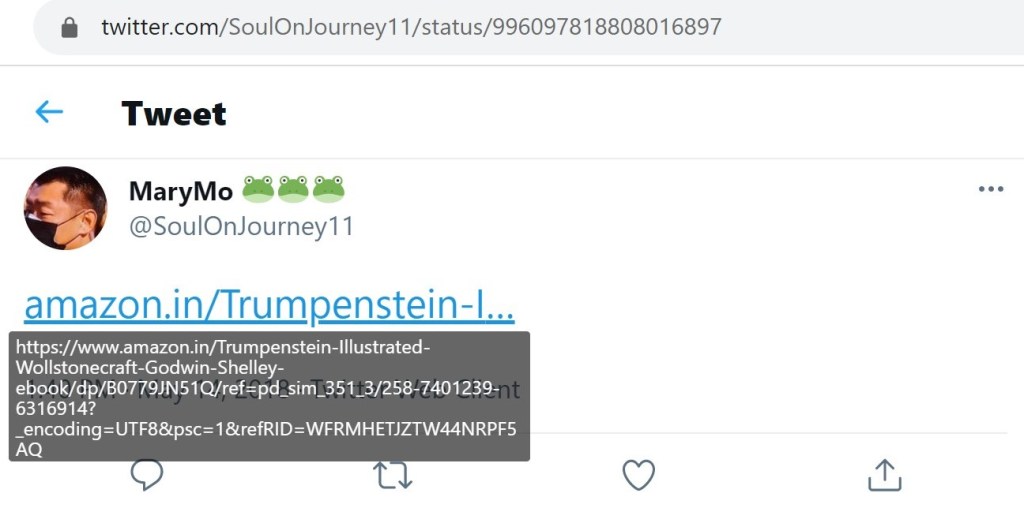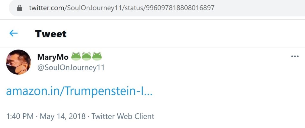 The only Twitter account I found which directly linked to the Trumpenstein eBook was @SoulOnJourney11. This account also tweeted a link to the modified Wizard of Oz eBook and to the Hillary Clinton in Wonderland eBook.