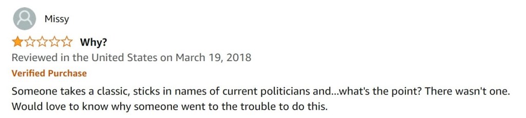 That these publications appeared within just a few days following Q’s posts about the Hillary Clinton in Wonderland eBook does not appear to be an accident. Trumpenstein came first, naturally, since it serves to further build upon the Hillary Clinton Fan Club red herring. But since this was put together in a rush, the creator forgot that crucial attribution on the title page. I find the sole review of Trumpenstein to be both a bit funny and on the mark.
