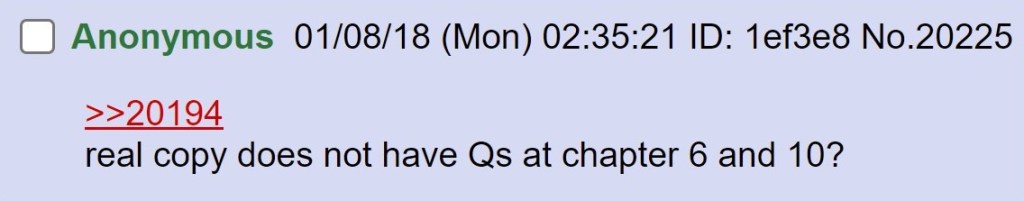 This event would not be of any particular note, if not for the alterations within the pirated PDF that Wikileaks promoted. Following Wikileaks tweet, anons on 4chan and 8chan began discussing how 2 of the chapter titles had been altered to contain a Q.