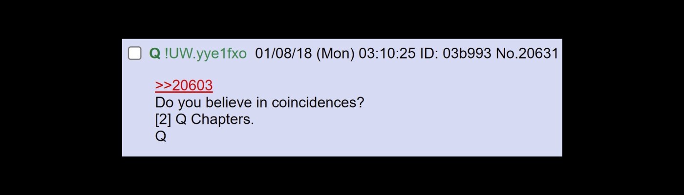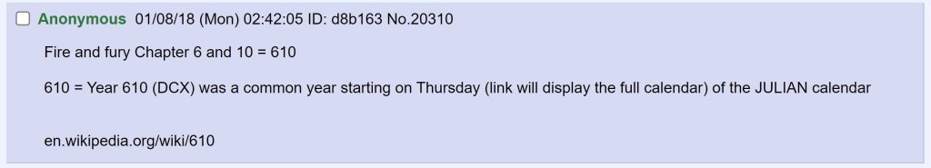 The morning of January 8th (UTC+0) was one of Q’s busier ‘QProof’ days. The very next Q post (#500) included a mention of “Fire & Fury,” which ensured that 8chan users could be certain that the 2 chapters that Q mentioned were from that book. Q would go on to post several other purported QProofs that morning, but those are not our focus here.