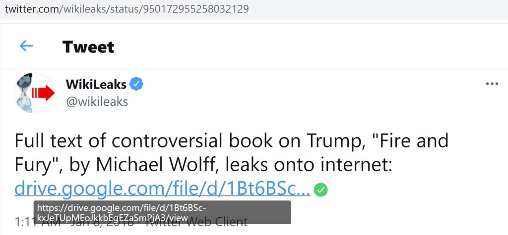 Trump was not behind this, nor was Wikileaks, although Wikileaks was the primary initial reason the Fire and Fury PDF gained traction and attention. It existed online prior to Wikileaks’ promotion of it. The above Project Lakhta post and other posts establish this as a fact. Notably, the above date of Project Lakhta’s post is only in reference to when that retweet took place. The tweet itself could have been posted on the 5th, 6th, or 7th. Following the book being made available for purchase on the 5th of January, it could have been pirated and released online on that day or the following two days. The date of the tweet itself is unclear as the account has since been suspended.