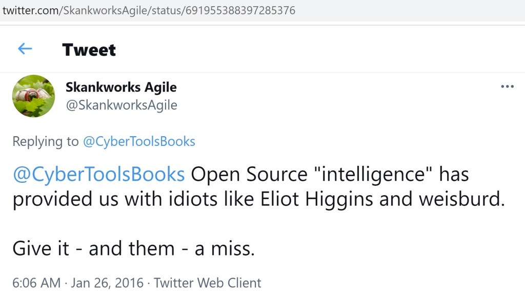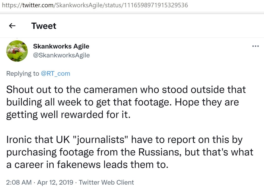 The reply to Russia Today is just one of many and in this case, the reply ‘affirms’ that Russia Today is the real news and UK journalists are fake news. Targeting Eliot Higgins and/or Bellingcat is relatively standard fare for these sorts of accounts. None of this is exactly shocking. I personally find the semi-automated repetitive posting method to be a bit more remarkable. It is rather clever, I must say.