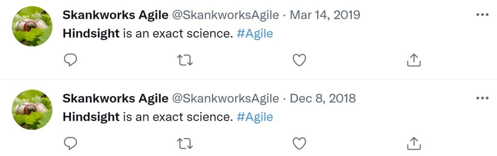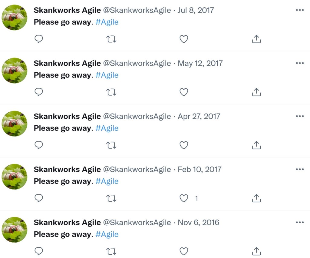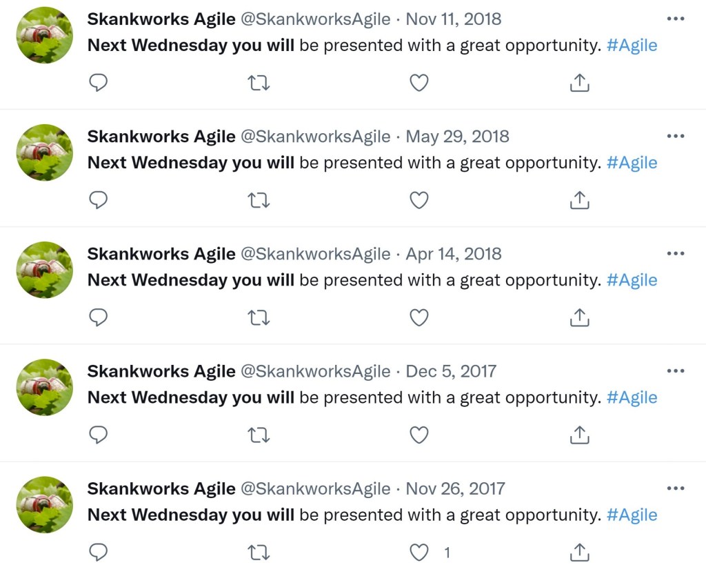 Much of this repetitive content looks like generic fortune cookie notes, mixed with generic quotes. For an account that isn’t trying to draw too much attention, this makes some sense. Most people wouldn’t have noticed this account and if they did, they’d have seen generic content without catching the repetition. All these types of tweets are going out into the void, not in reply to any other users, which also helps keep this account off the radar until necessary. A review of the archives of the since-suspended @TheSkankworks account reveals that much of the activity was just like the activity we see on @SkankworksAgile. The only difference in most cases, as seen below, are the hashtags.