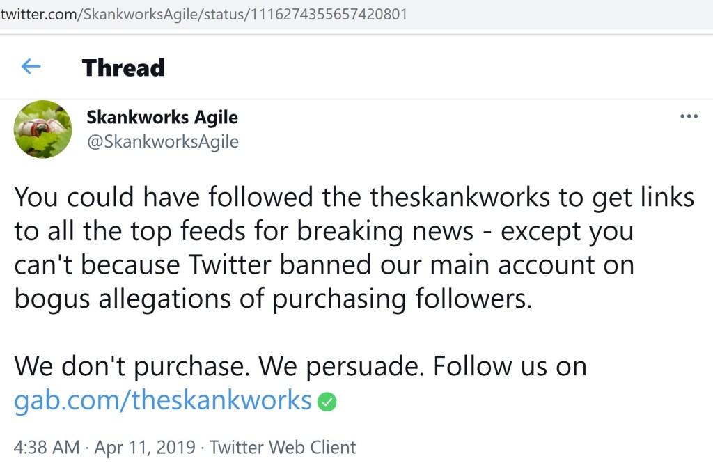 The bio for @SkankworksAgile is quite something. But to be clear, this account doesn’t seem designed to attract much attention, at least most of the time. The bio below has been updated since I documented it around 10 days ago, but here’s an archive of the account from before that update, for reference.